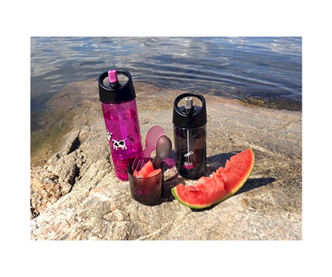 Original botella de agua de tritán para que los peques la lleven al cole, al parque o de excursión. Es muy resistente, cuenta con una tapa con asa que facilita el transporte y tiene una boquilla desplegable por la que los peques pueden beber cómodamente.