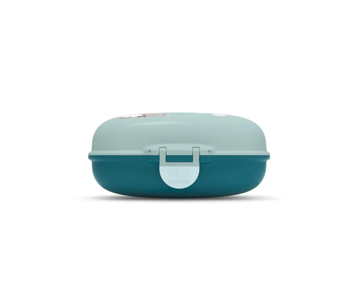 Con un look marcado por su lengüeta de cierre, esta snack box de formas divertidas puede personalizarse gracias a sus fichas intercambiables.