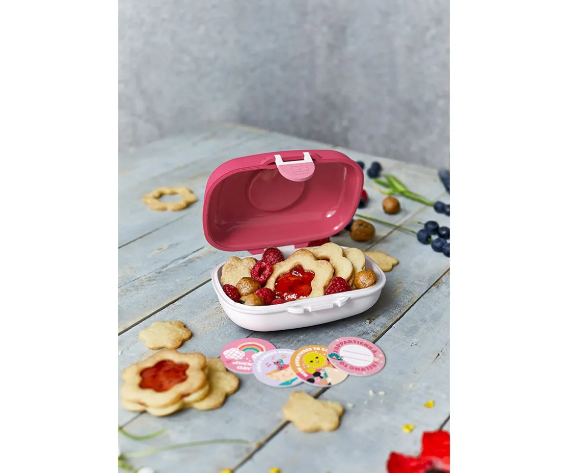 Con un look marcado por su lengüeta de cierre, esta snack box de formas divertidas puede personalizarse gracias a sus fichas intercambiables.