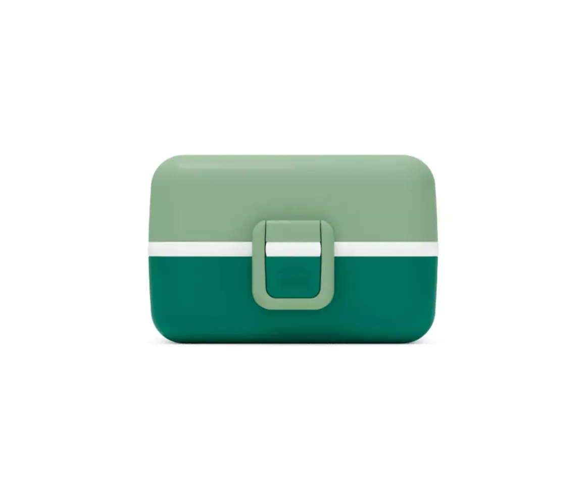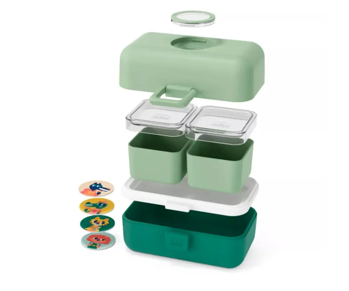 Caja de almuerzo donde podrás llevar entrante, segundo y postre. Una caja fácil de abrir gracias a sus prácticos cierres de clic y hermética para mantener la comida. Esta caja de almuerzo compacta con diferentes compartimentos incluye fichas ilustradas para colocar en la parte superior de la cajita y así tu peque se divertirá viéndola.