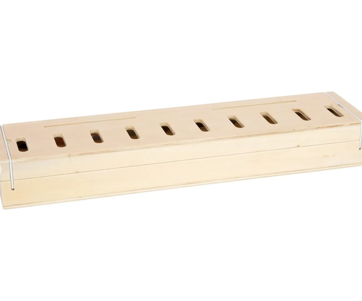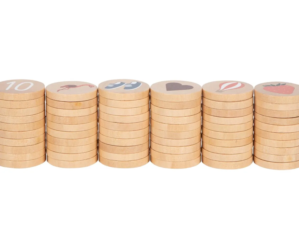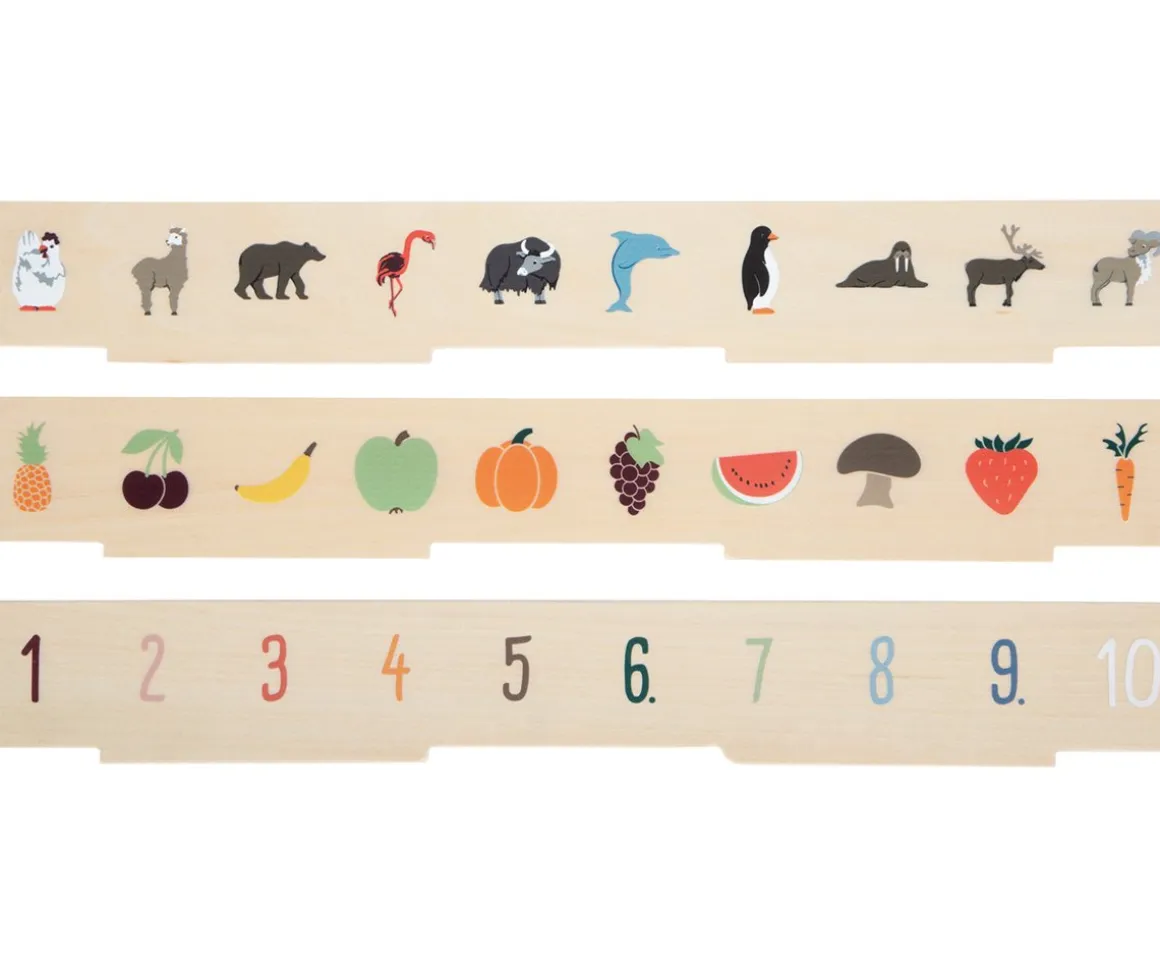 - Incluye: 1 caja de madera, 3 listones con imágenes por ambos lados y 60 fichas de imágenes con temas de: movilidad, animales, números, formas, prendas de vestir, frutas y verduras