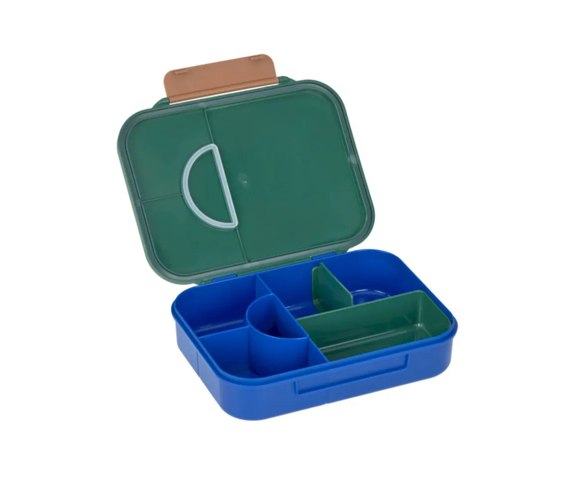 Caja de almuerzo con 4 compartimentos fijos y 2 accesorios adicionales extraíbles para dividir los alimentos, ideal para llevar al cole, de excursión o al parque. En el compartimento central te permite llevar salsas o yogur ya que su junta de silicona hace que no tenga derrames ni se mezcle con los otros alimentos de su interior.