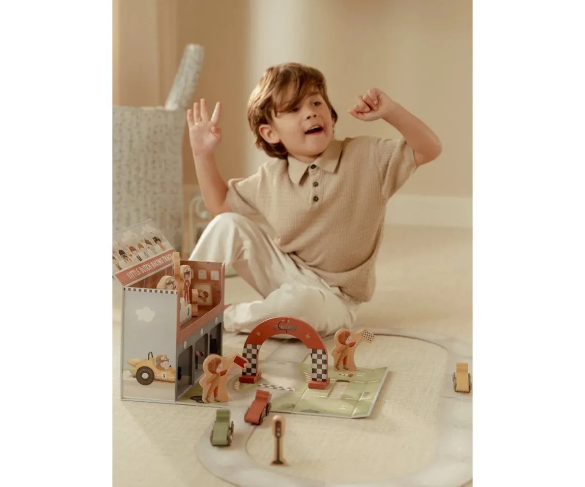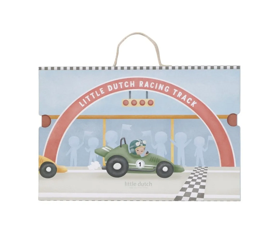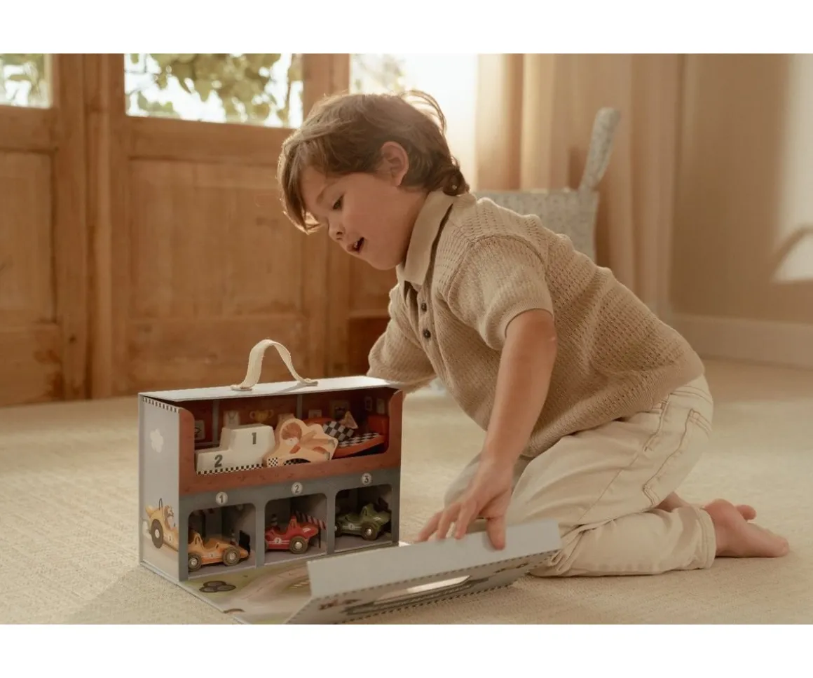 La Caja de Juego con Pista de Carreras de Little Dutch es mucho más que un estuche: se transforma en una pista completa donde los más pequeños podrán organizar sus propias competiciones.