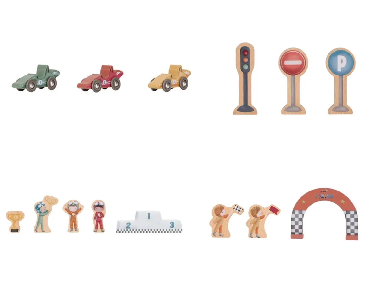 - Incluye: 3 coches de carreras de madera, 3 pilotos, línea de meta, señales de tráfico, trofeo de ganador, podio, piezas de cartón ensamblables