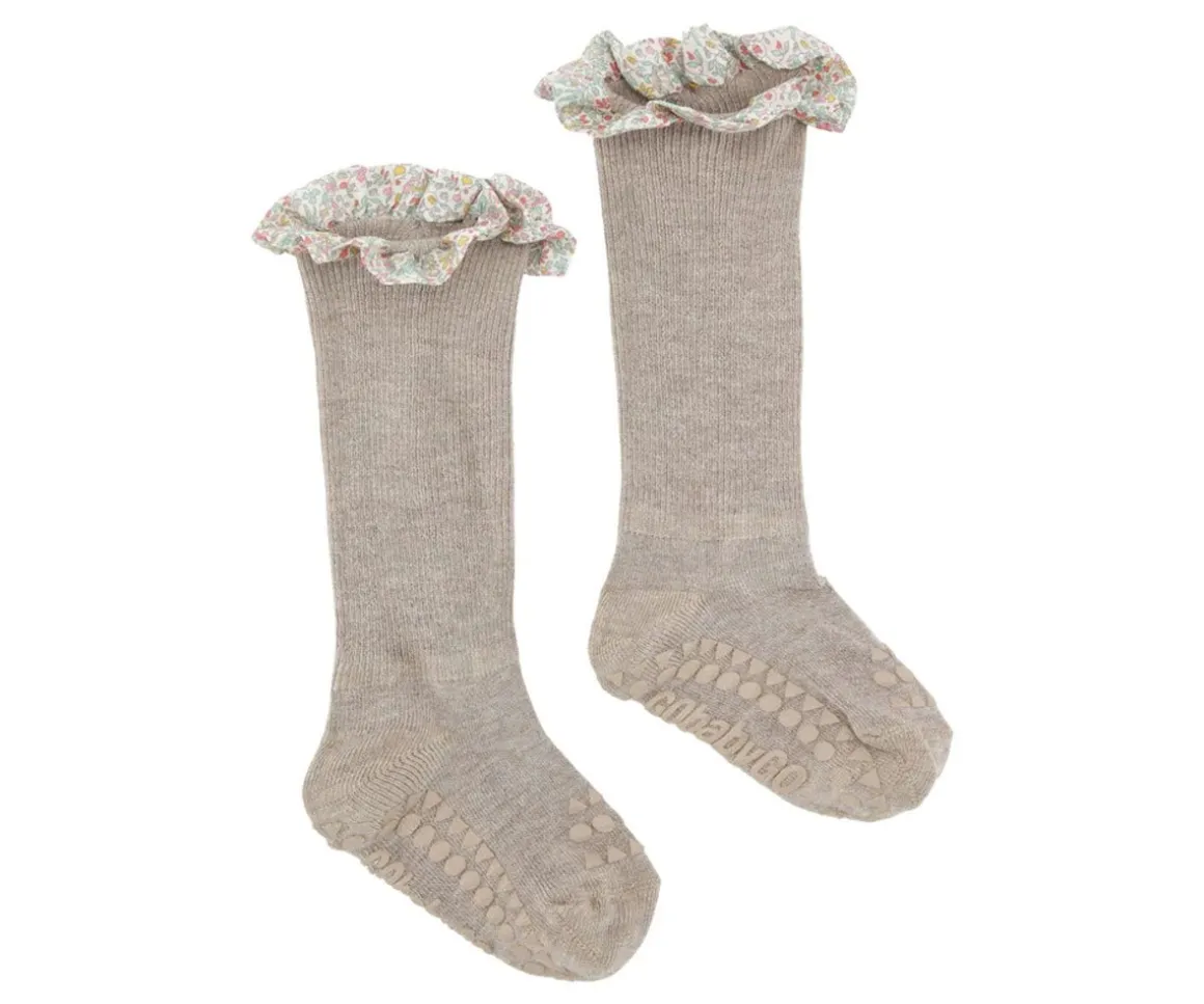 Exclusivos calcetines de bambú con un lindo volante en los conocidos estampados florales de Liberty. Los calcetines se pueden llevar recogidos o doblados para combinar con la ropa.