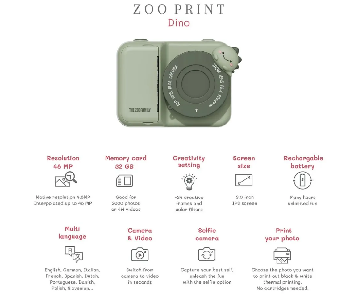 La cámara digital de impresión zoo de The Zoofamily, tiene una resolución de 48 megapíxeles, puedes usar tanto la cámara delantera cómo la trasera para selfies y puedes grabar vídeos hasta de 4 horas de duración.