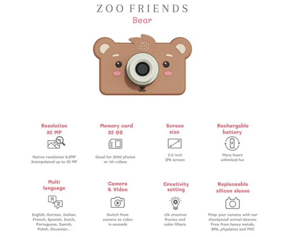 La cámara digital para niños Zoo Friends de The Zoofamily con 32 megapíxeles y grabadora de vídeo, tiene un adorable diseño de un osito. Es pequeña, pesa poco e incluye más de 20 filtros y marcos digitales.