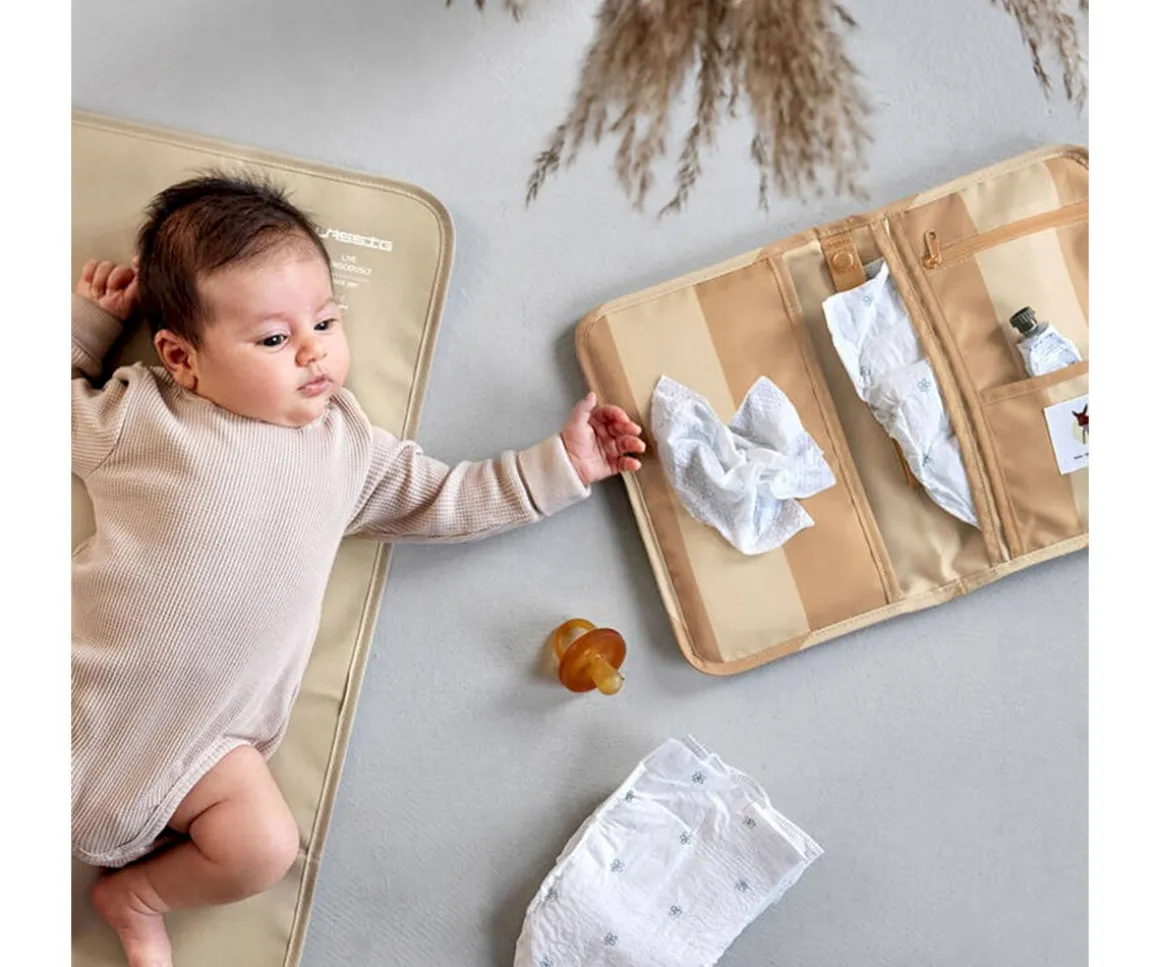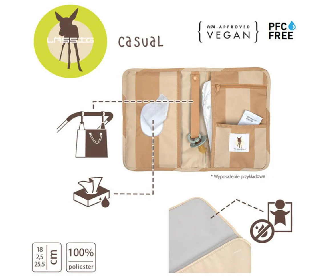 El cambiador de LÄSSIG es ligero, compacto y cabe en cualquier bolso o mochila. Incluye un cambiador acolchado repelente al agua, un compartimento para pañales, otro para colocar las toallitas, un bolsillo con cremallera y una cinta para el chupete, ofreciendo un cambio rápido y organizado en cualquier lugar.