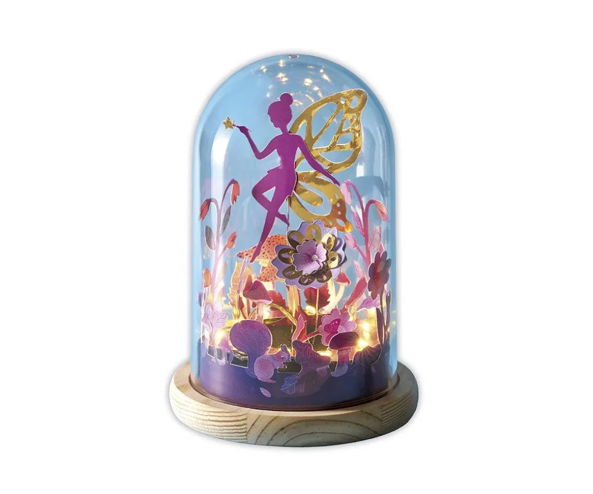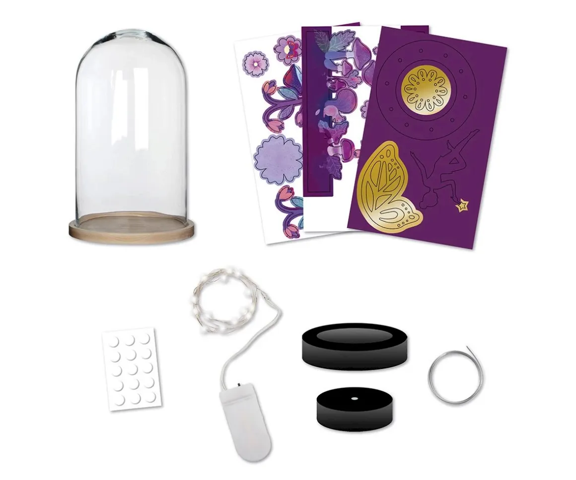 - Incluye: 1 campana transparente de plástico, 1 soporte de madera, 1 guirnalda luminosa con pilas incluidas, 1 disco de espuma, alambre, puntos autoadhesivos, 2 tableros ilustrados precortados, 1 tablero dodardo precortado, libro de instrucciones