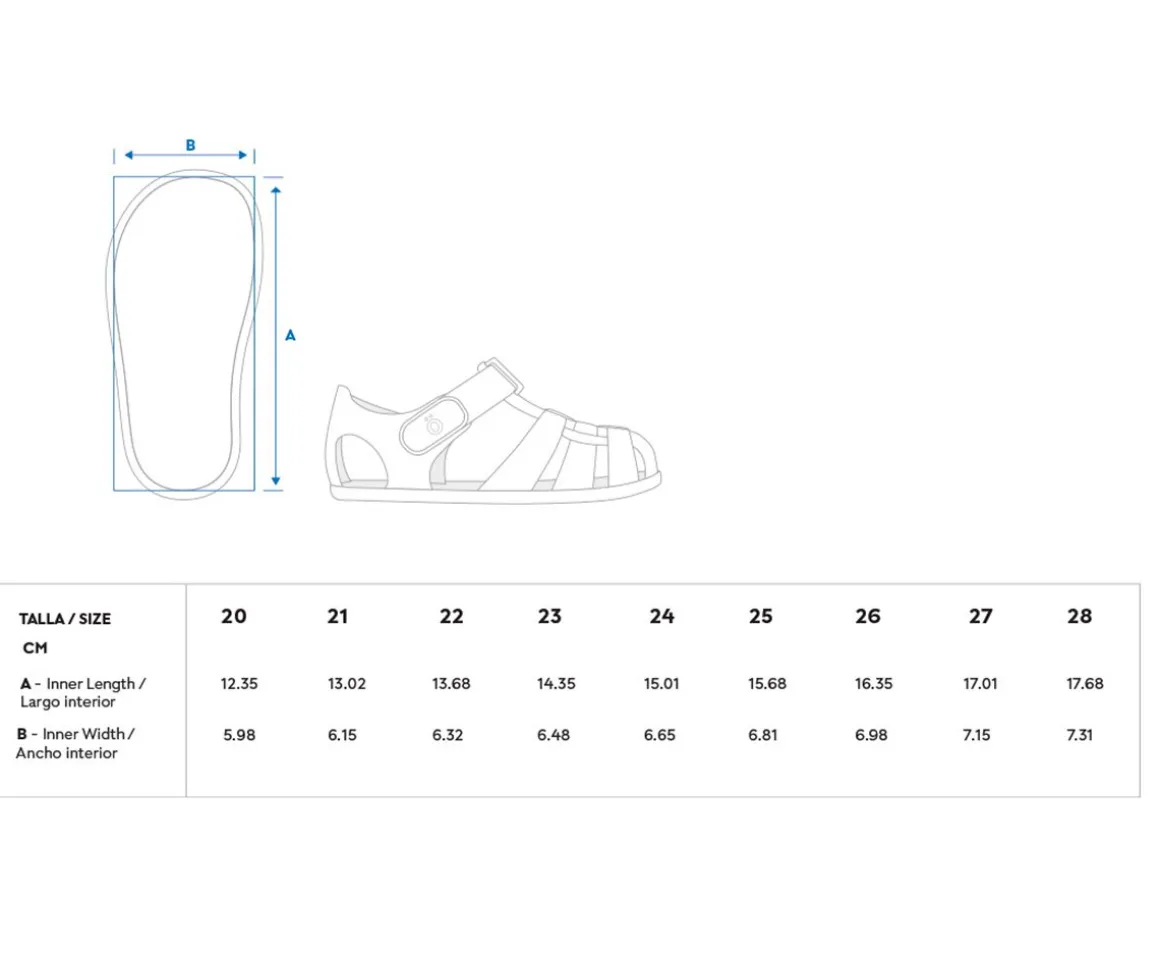 - ATENCIÓN: Las medidas de la tabla corresponden a este modelo en concreto y de la suela interior del zapato. Puedes compararla con la medida del pie de tu peque