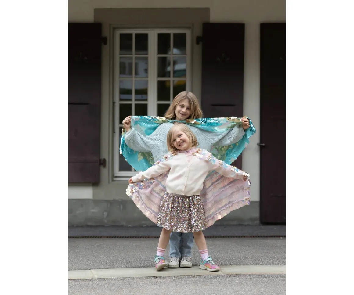 La capa decorada con una combinación de lentejuelas grandes y pequeñas dispuestas en franjas es la prenda perfecta para quienes disfrutan del brillo, el movimiento y la imaginación.
