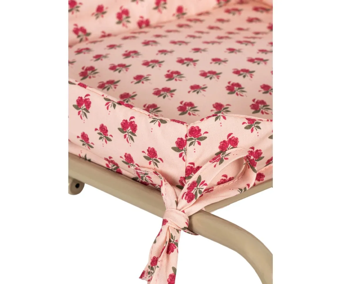 Original carrito de compras con un bonito estampado de cerezas, con ruedas delanteras giratorias, cestita de gran capacidad y bandeja inferior de tela para que los pequeños compradores puedan almacenar todos sus artículos de compra. En la bandeja superior dispone de un asiento para colocar al muñeco