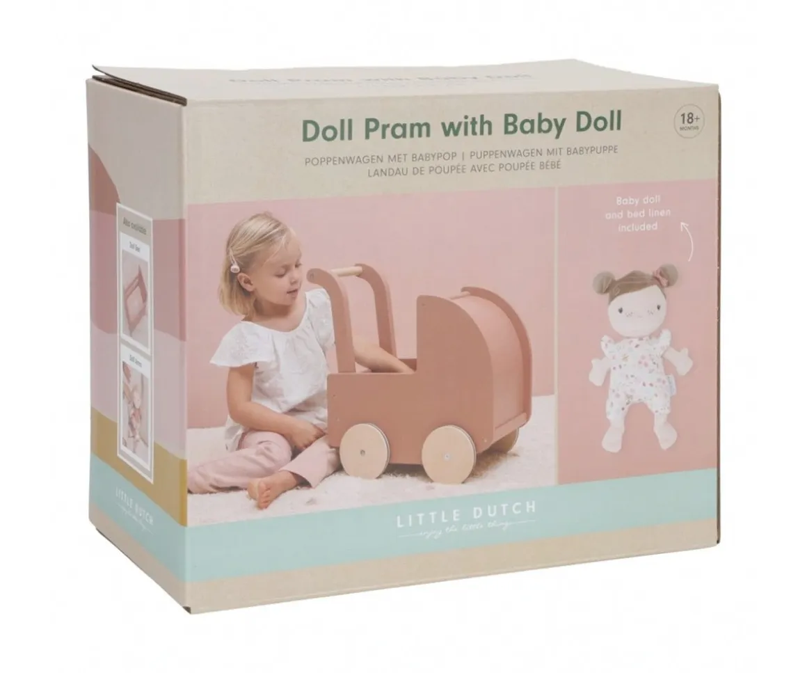 El carrito para muñecas de estilo vintage de Little Dutch viene acompañado de una muñeca suave y encantadora.