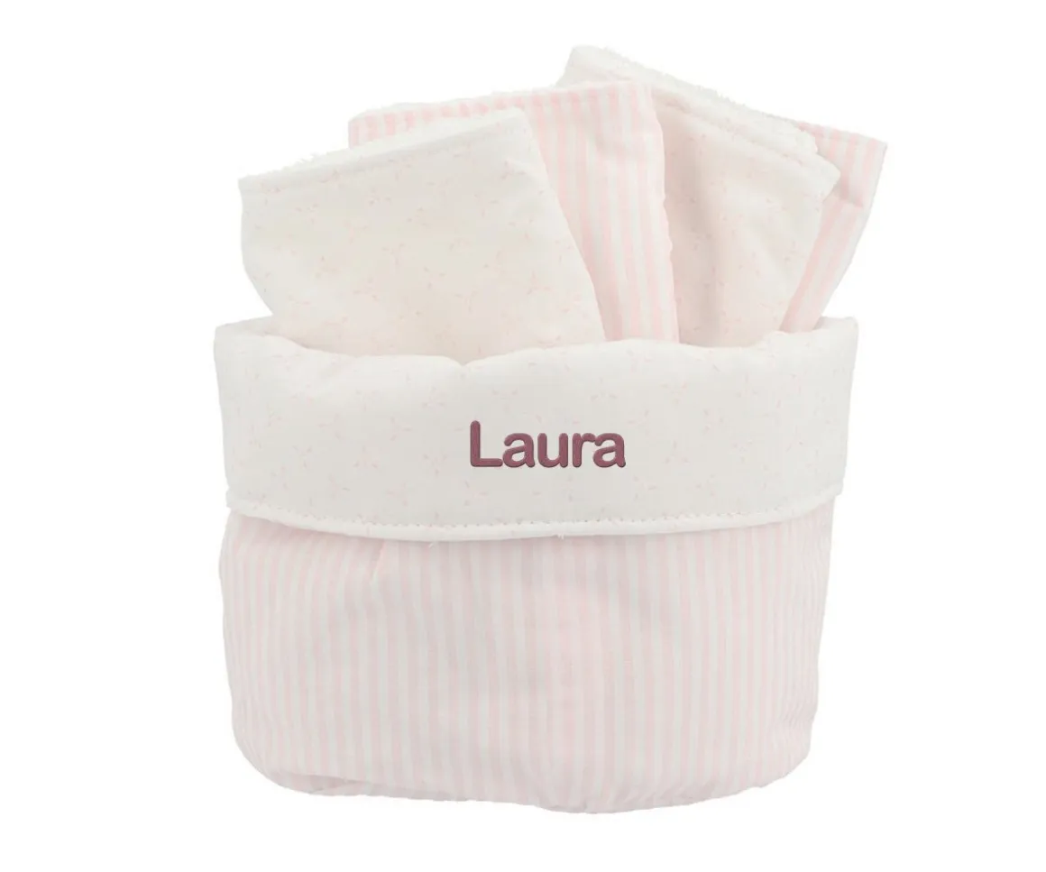Cesta organizadora de tamaño pequeño para poder colocar y tener a mano, las cremitas y los pañales del bebé. Incluye 4 toallitas secababitas a juego con la colección Dorset Rosa.