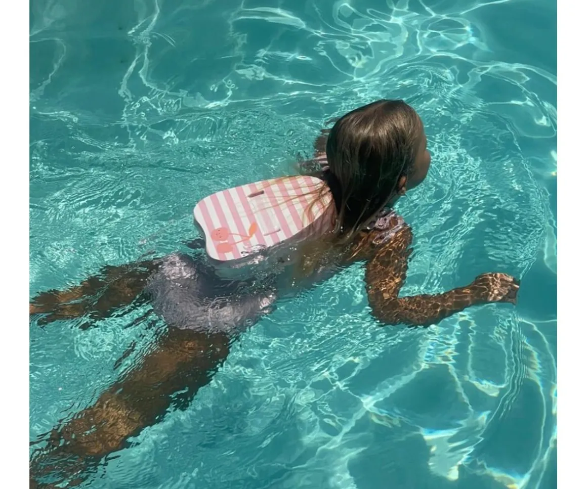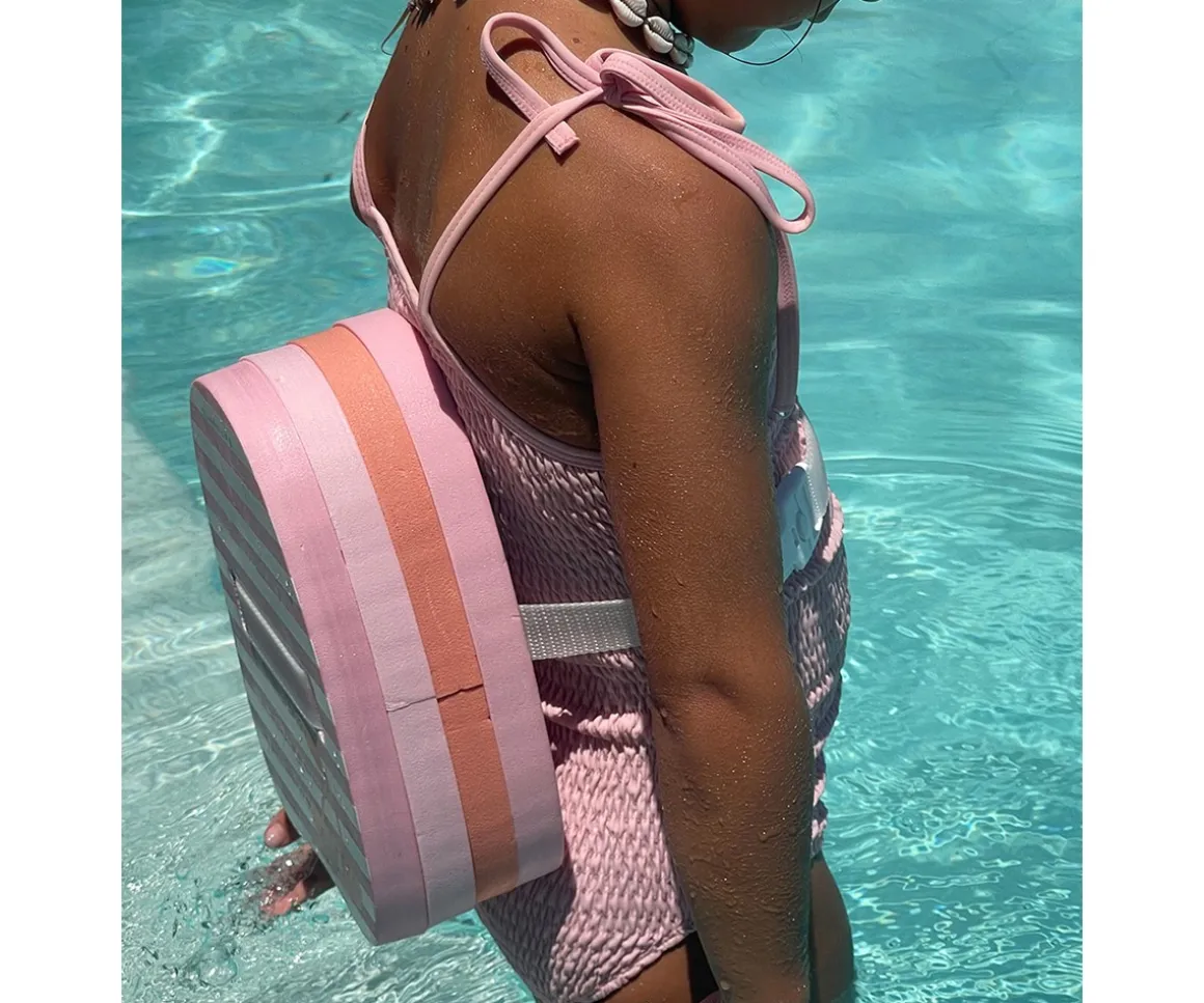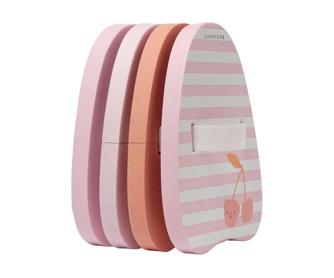 Tabla de flotación con cinturón Sunnylife con estampado en varios tonos rosas y una cereza. Será un elemento de ayuda para aprender a nadar y mantenerse en el agua.
