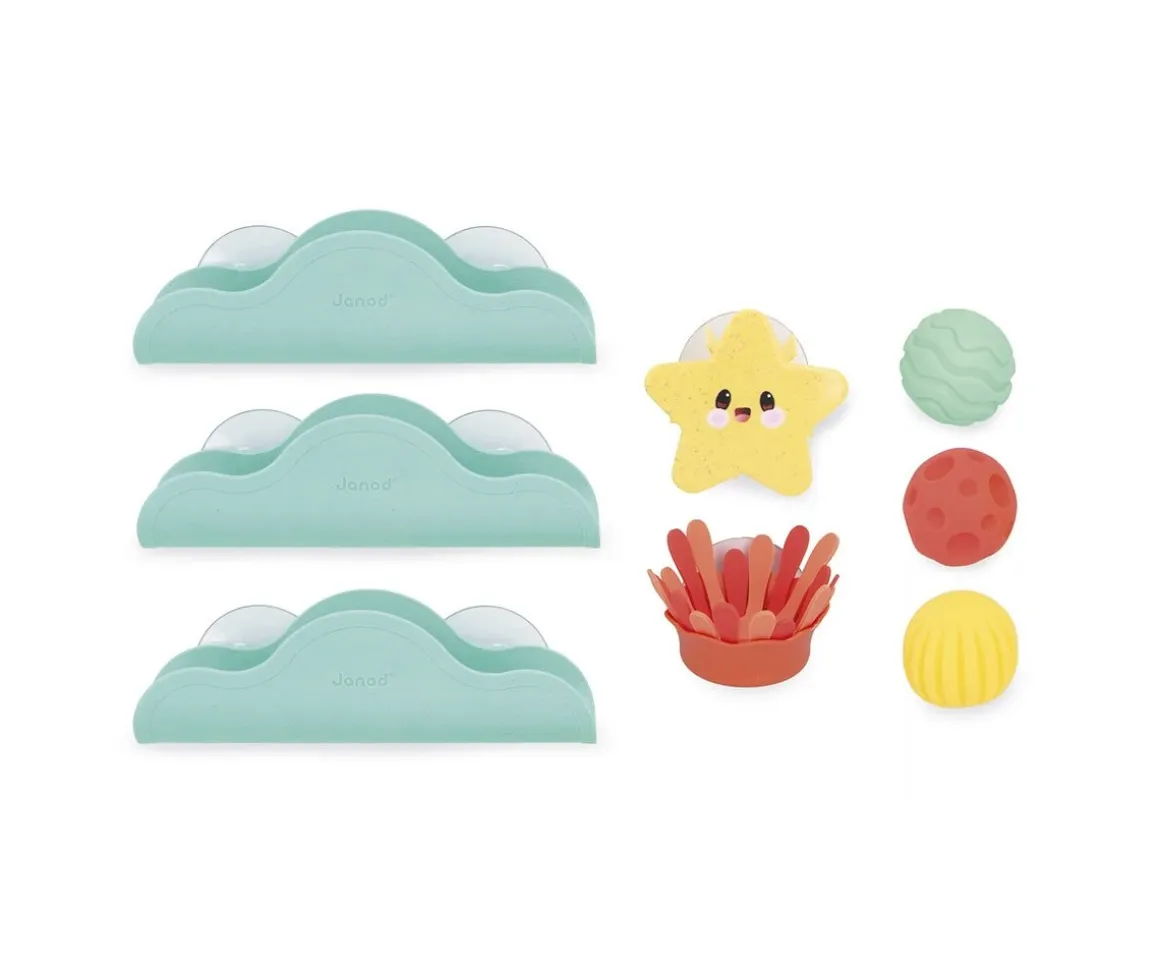3 toboganes, 3 bolas sensoriales, 1 estrella de mar giratoria y 1 anémona marina. Todas poseen ventosas para poder fijarlas y crear un divertido circuito para que los peques dejen caer las bolas.