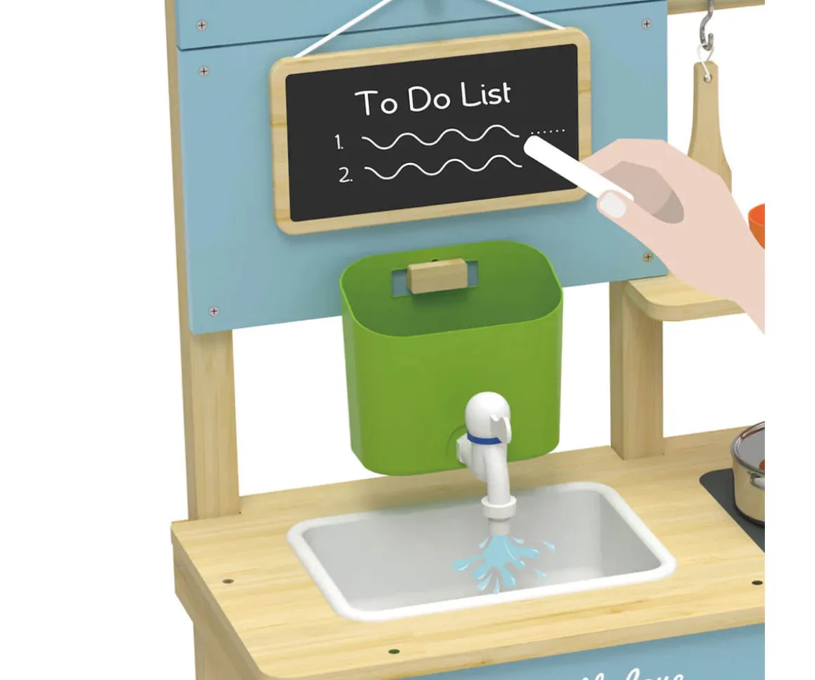 - Incluye: cocina de madera, 12 accesorios de madera (ollas de acero inoxidable, espátula de madera, tazas, fregadero, una pizarra para escribir el menú y un cubo con grifo)