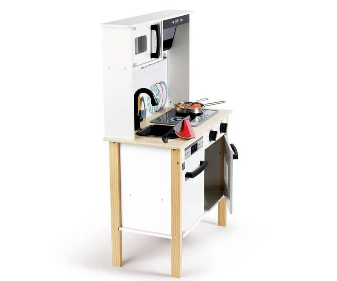 Entra en un mundo de creatividad culinaria con la cocina interactiva de Hape, llena de accesorios útiles, sonidos y luces realistas que se activan pasando la mano.