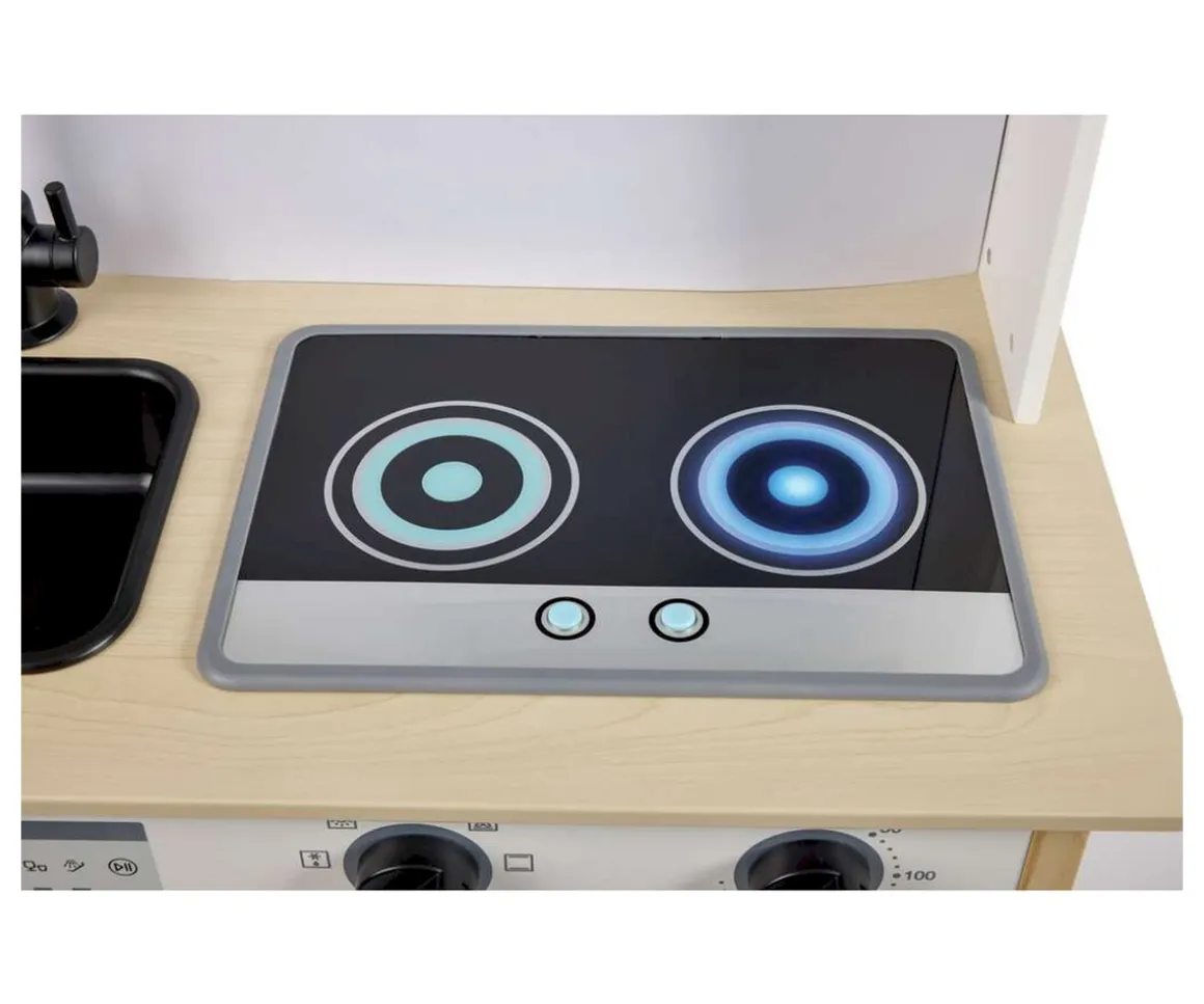 Pero espera, ¡hay más! Un grifo con fregadero para lavar los ingredientes, una vitrocerámica con botones que iluminan los fuegos y suenan, y dos ruletas del horno que hacen sonidos realistas al girar.