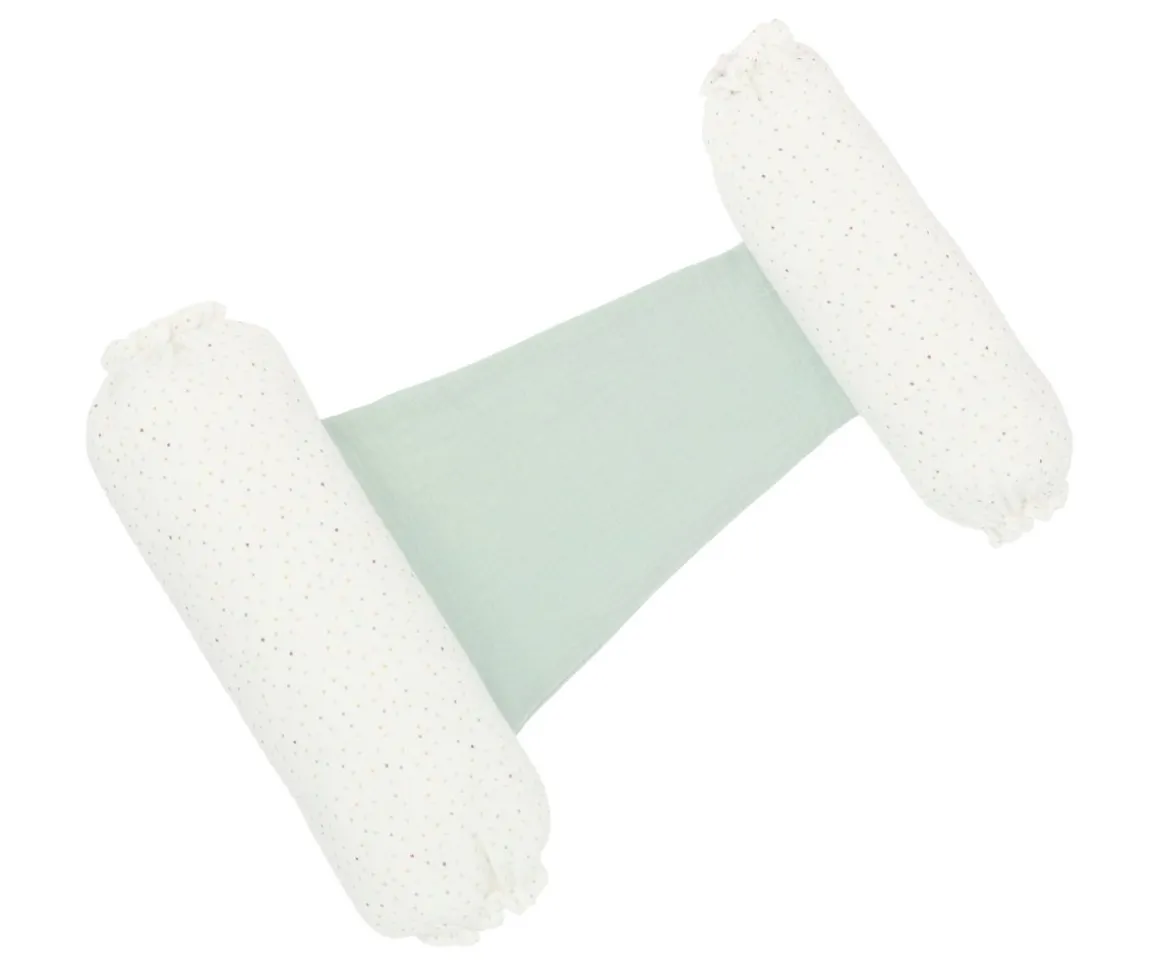 Este cojín antivuelco de sujeción para el bebé, consiste en 2 suaves y acolchados cojines ligados por una suave tela de algodón. Además de ser muy confortable, evitará que el niño se voltee sobre su vientre al dormir durante sus primeros meses.