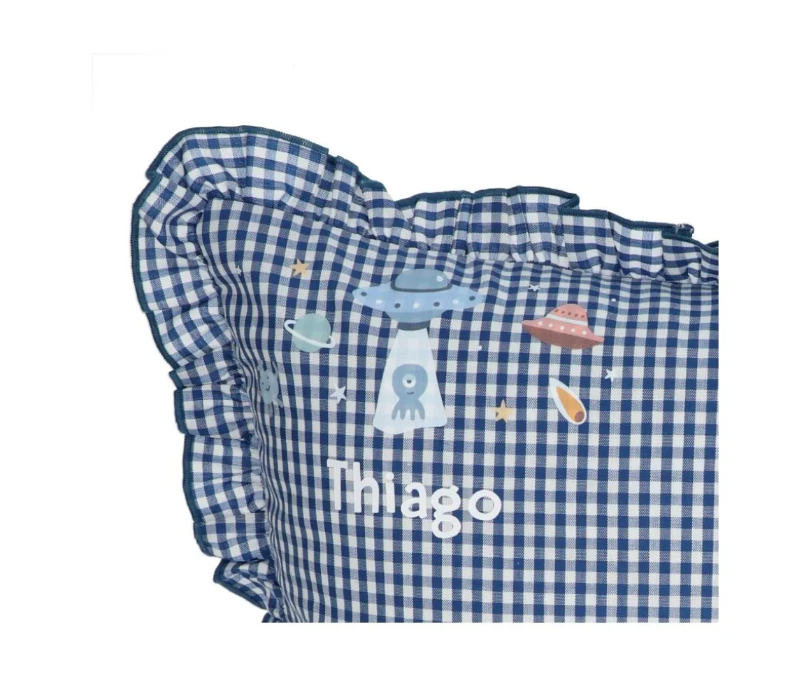 Cojín con volantes y estampado vichy, personalizado, ideal para llevar al cole, para decorar su cuarto o su rincón de lectura favorito.