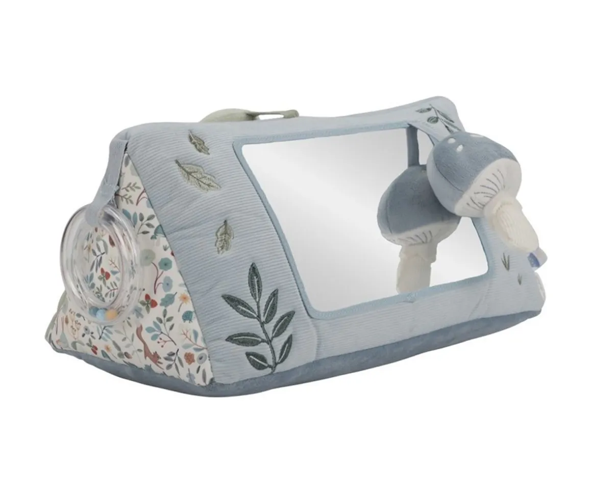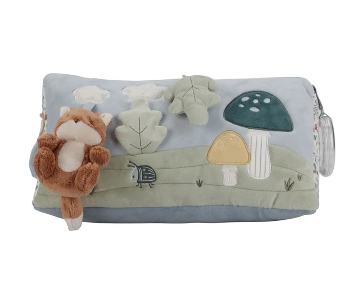 Cada lado presenta una actividad y tiene varias texturas, formas y características estimulantes como hojas de flores crujientes, divertidas texturas y animalitos y un divertido espejo.
