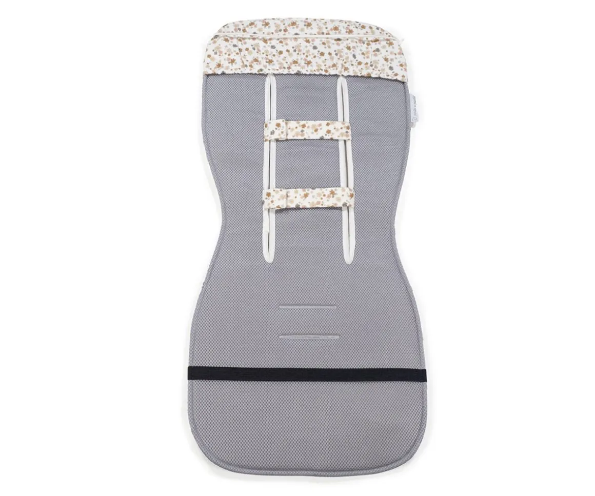 Con un tejido estampado transpirable que aísla la humedad y evita la sudoración excesiva, esta colchoneta se adapta a la mayoría de las sillas de paseo. Cuenta con aperturas y ajustes para cubrir la superficie donde se recuesta el peque, garantizando un paseo más confortable y protegiendo la silla de roces.
