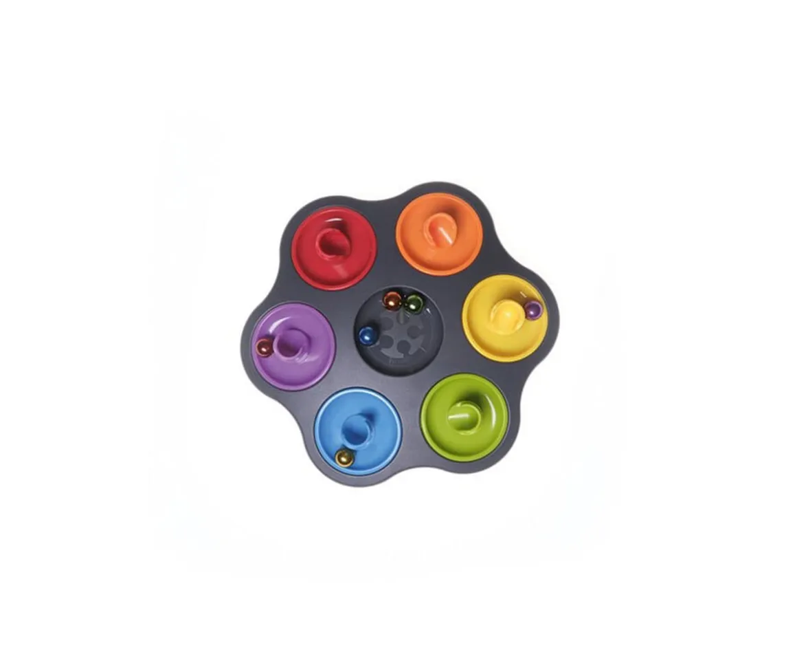 - Incluye: 1 tablero con 6 bases, 6 canicas, 2 espaciadores, 5 rampas cortas, 2 rampas largas y 1 tarjeta de desafíos