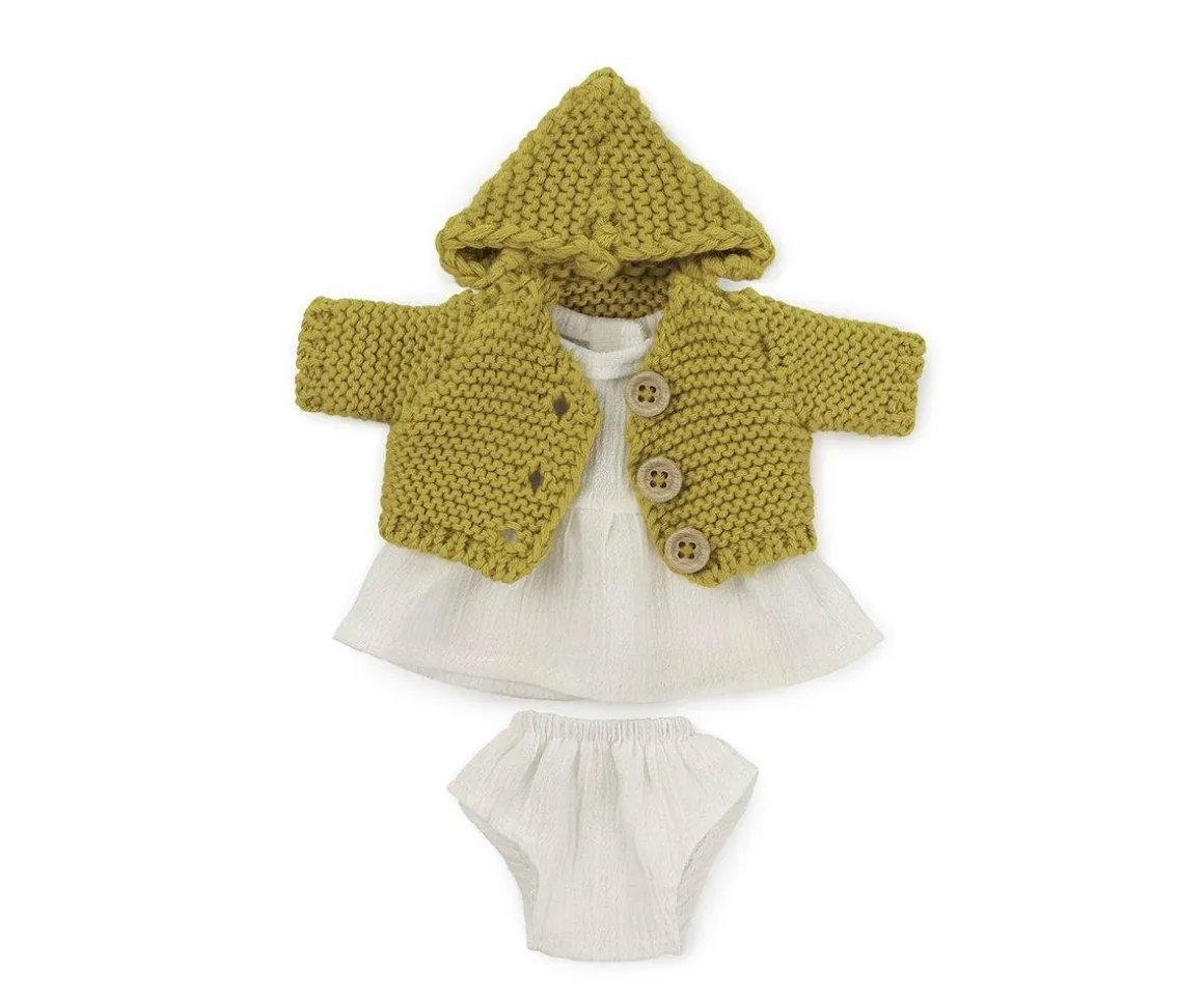 Conjunto de ropita para muñecas compuesto por blusita y ranita junto a una rebeca preciosa con capucha.