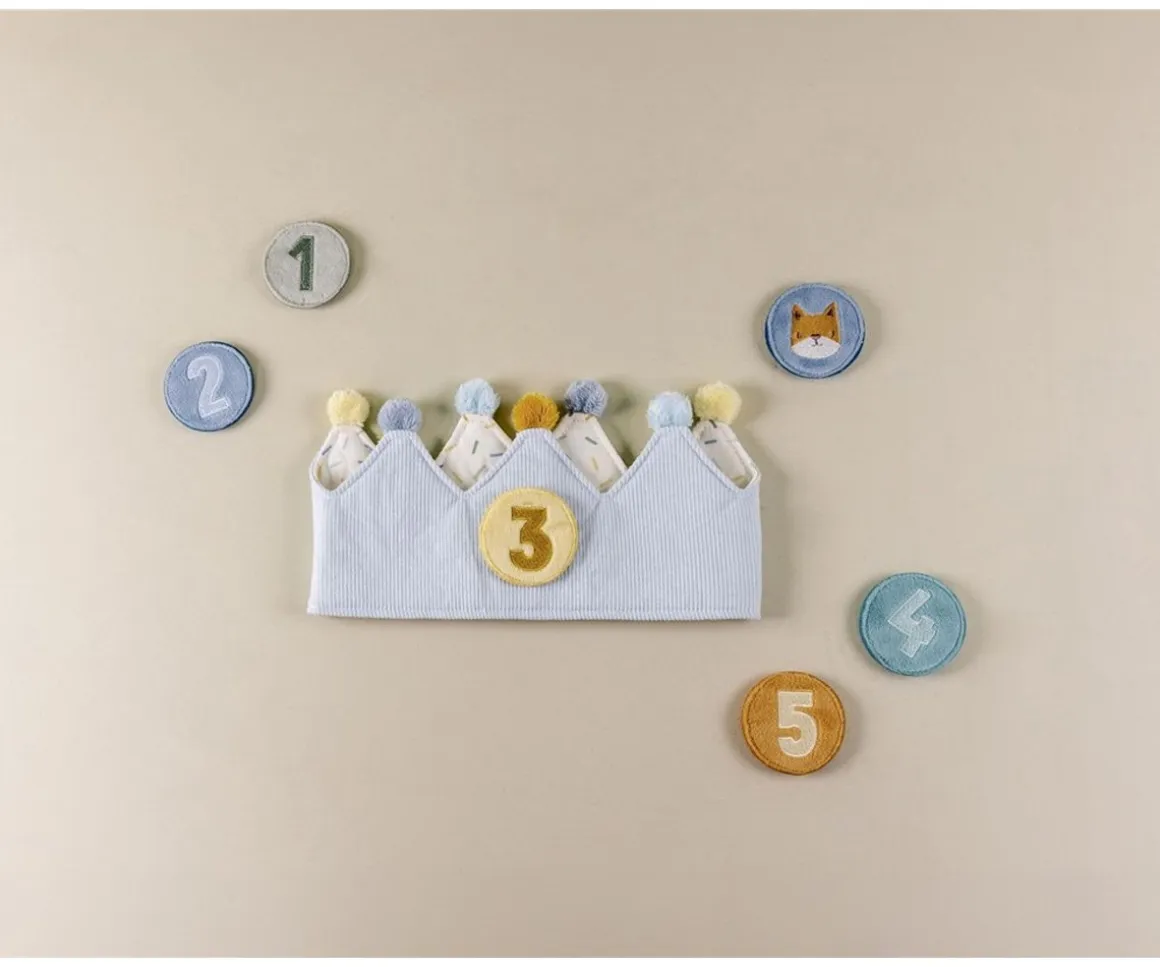 Esta preciosa corona con cierre de velcro será el complemento ideal para las celebraciones de cumpleaños de los peques. Confeccionada en tejido suave acolchado y acanalado de color azul con pompones en sus puntas, cuenta con números intercambiables del 1 al 5, lo que la hace ideal para acompañar a tu peque durante su crecimiento.