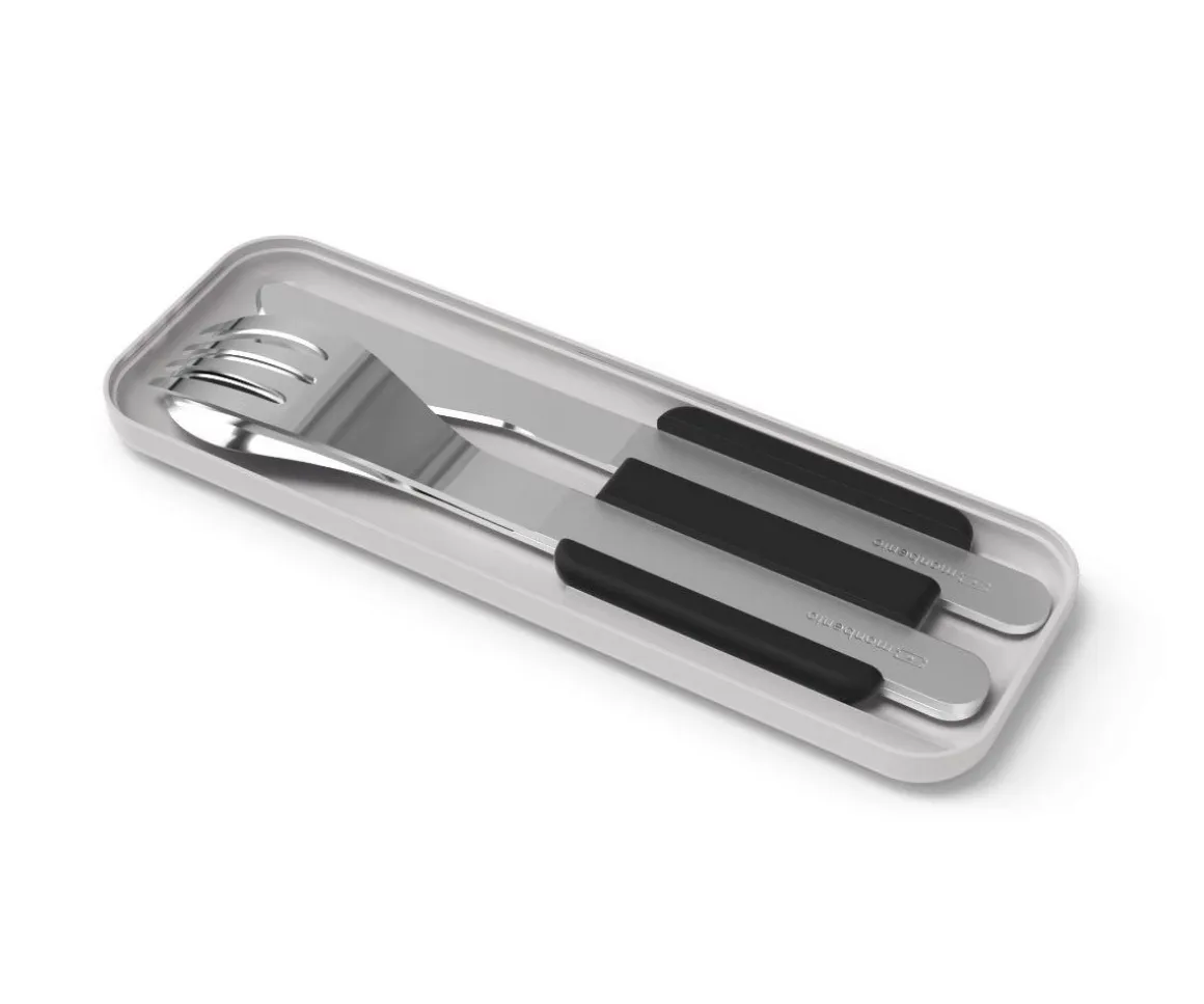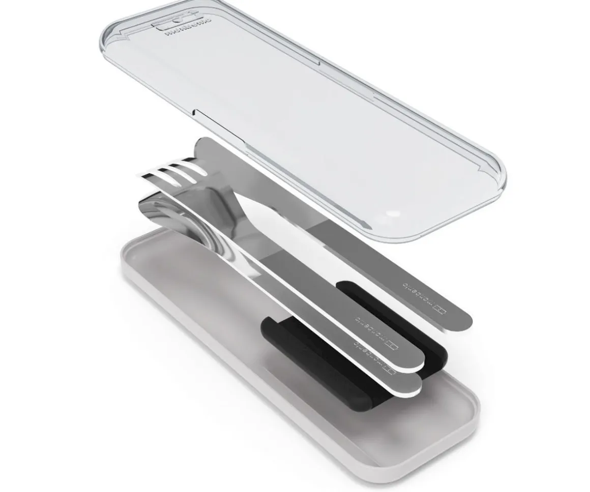 Este práctico set de cubiertos consta de un cuchillo, un tenedor y una cuchara que van guardados en una práctica cajita fácil de transportar y mantenerlos limpios.