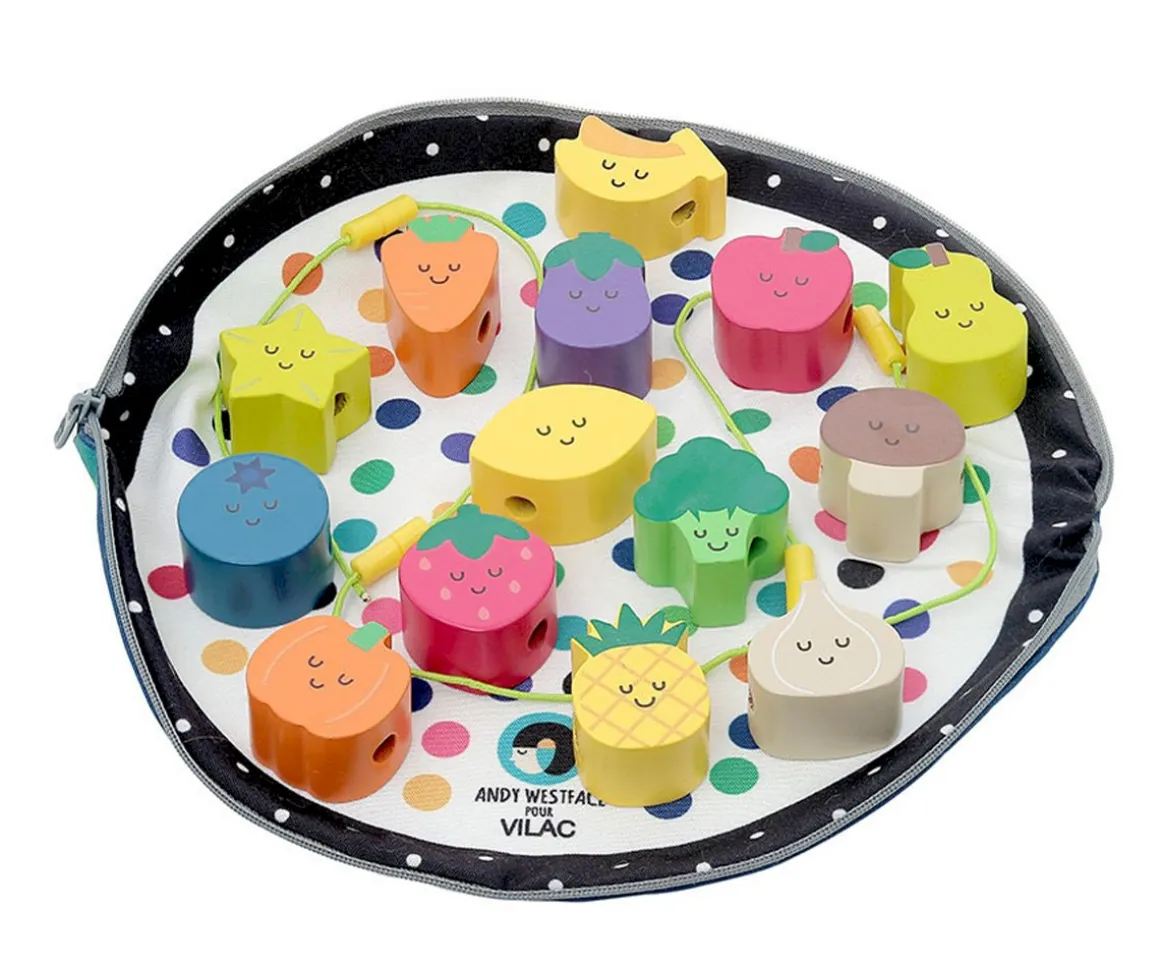 Hacer y deshacer, ¡qué placer enhebrar estas bonitas cuentas de madera con el diseño de Tutti Frutti! Frutas y verduras divertidas donde los peques descubriran las formas y los colores.