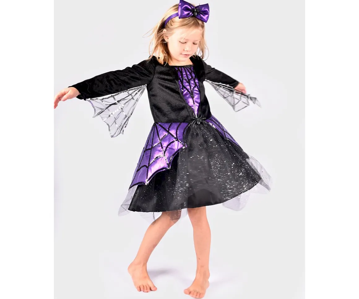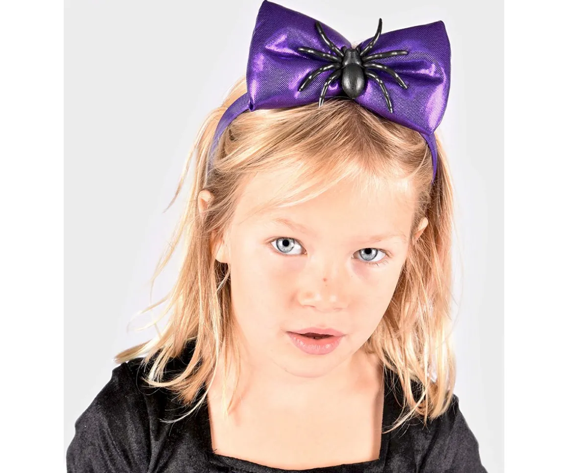 Además incluye una tiara decorada con un lazo morado y una araña de plástico.