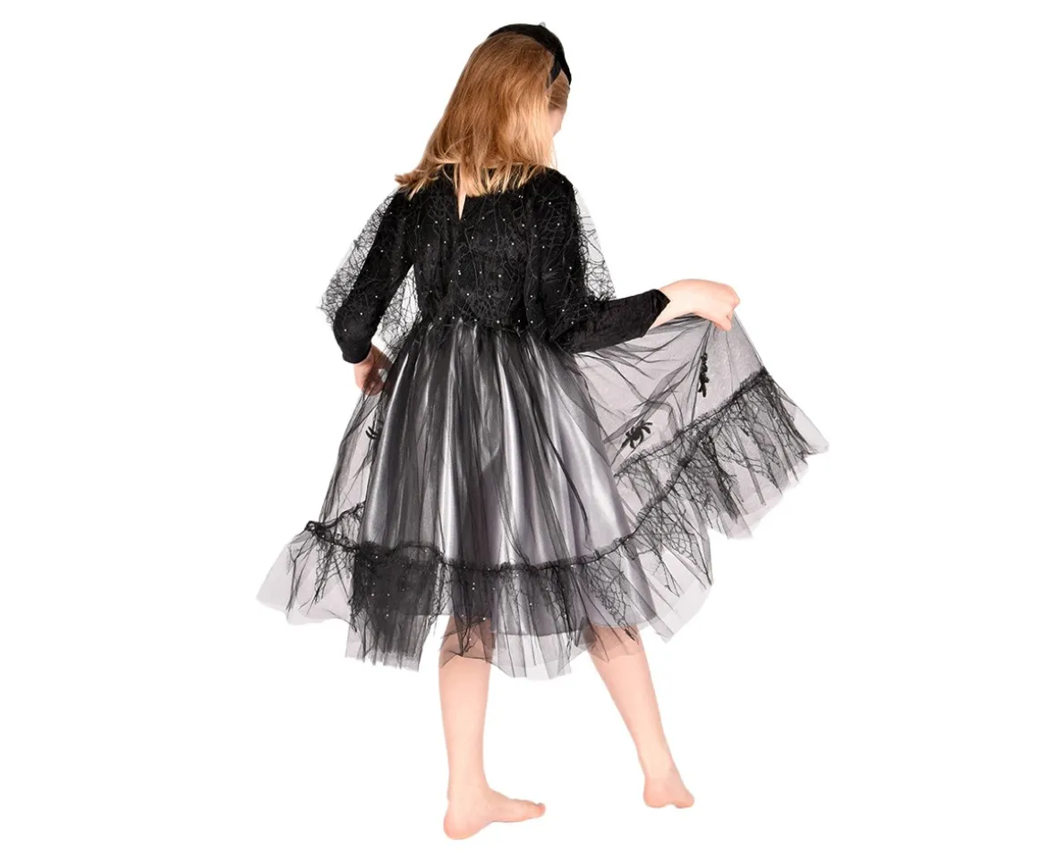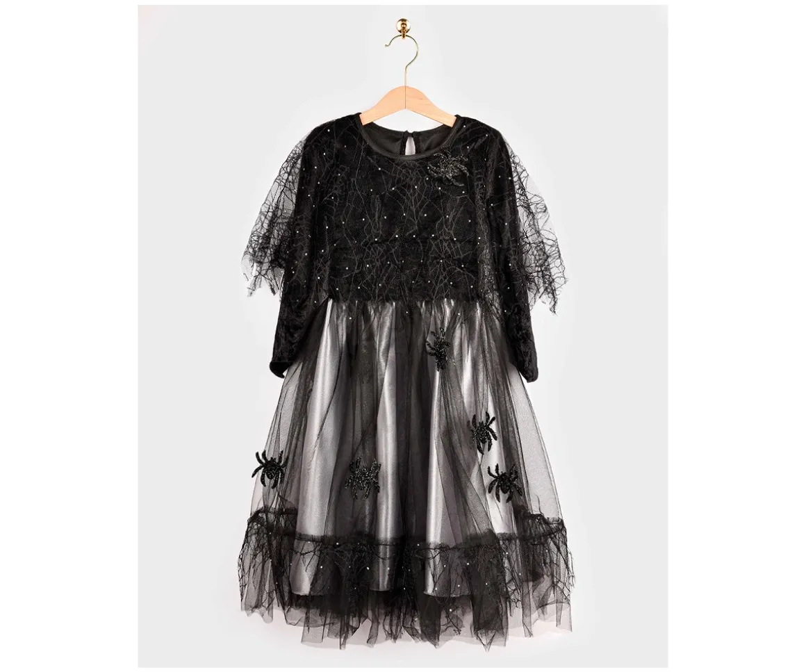 La parte superior del vestido está confeccionada en terciopelo negro suave con una bolero cosido en forma de telaraña brillante, decorado con pequeñas piedras plateadas. La falda está formada por dos capas: una falda inferior de satén plateado y una sobrefalda de gasa negra con adorables detalles de arañas brillantes.