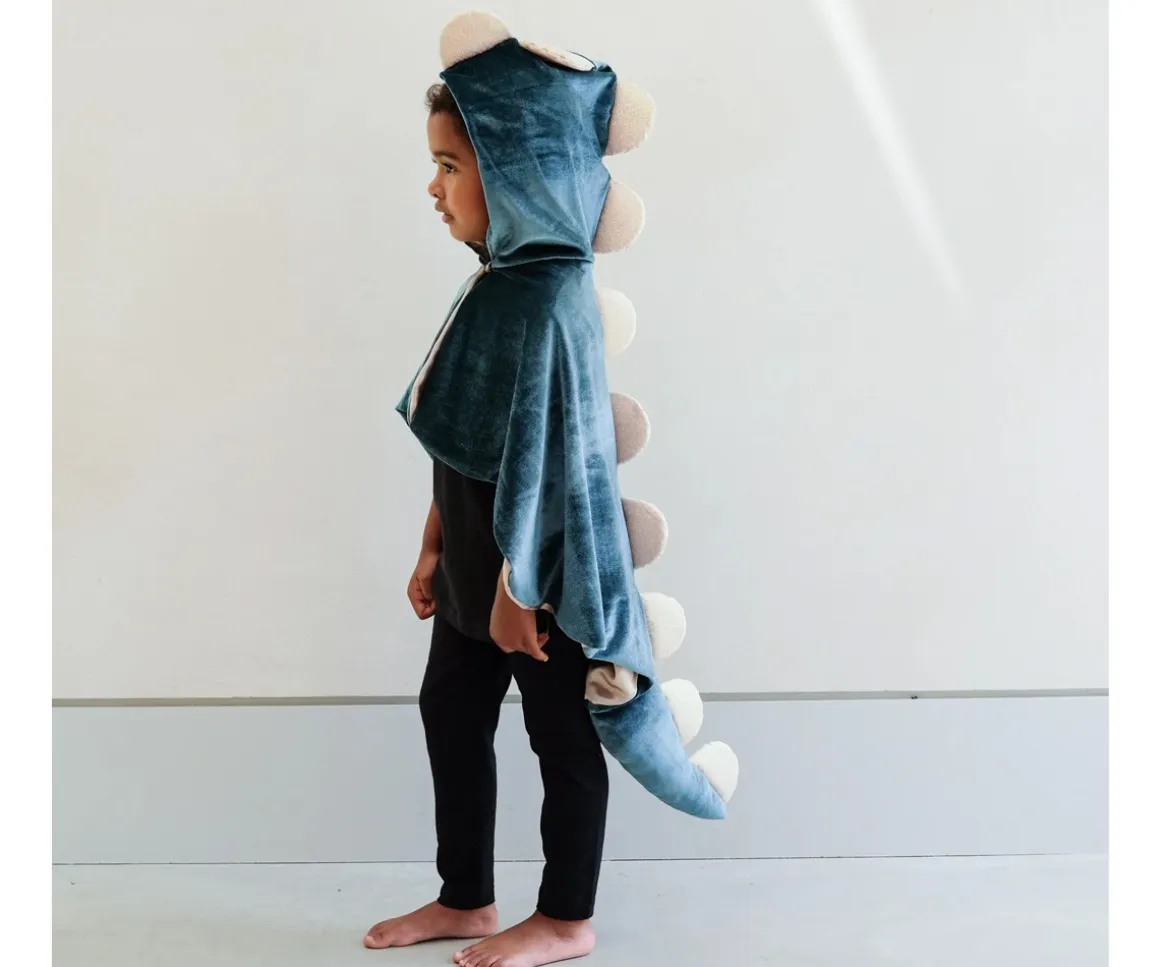 Una capa con capucha, cola y espinas festoneadas con purpurina con el que tu peque será el dinosaruio más aterrador de la fiesta.