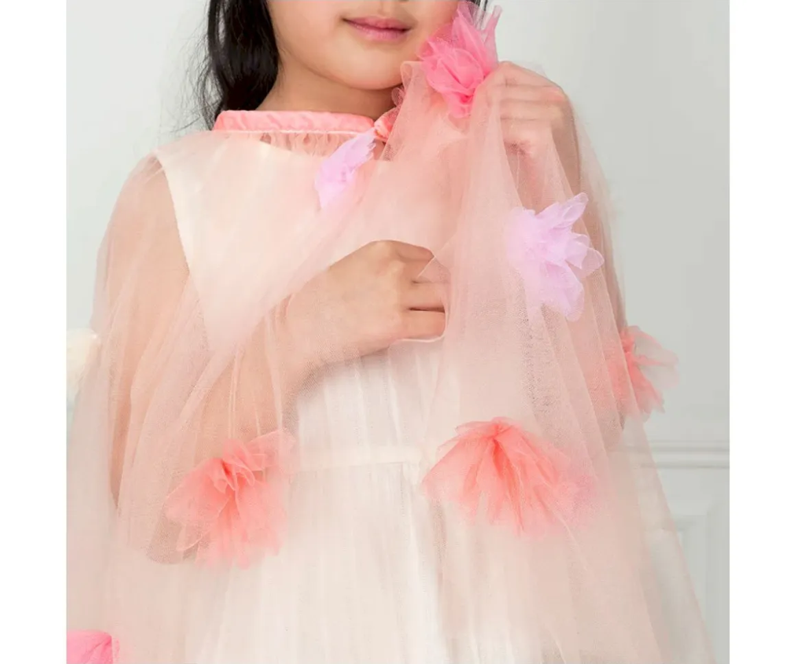 La preciosa capa confeccionada en tul de color melocotón adornada con flores de tul en rosa, melocotón, rubor y amarillo pálido de Meri Meri será el complemento ideal para el disfraz de los peques.
