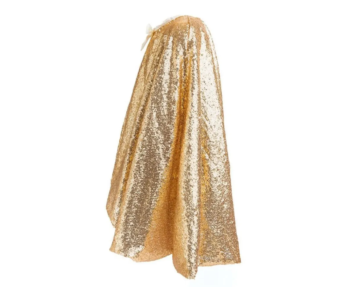 Con esta preciosa y brillante capa de lentejuelas doradas,el cuello está forrado suavemente y tiene un bonito lazo color crema. los peques se sumergirán en un mundo de fantasía y magia.