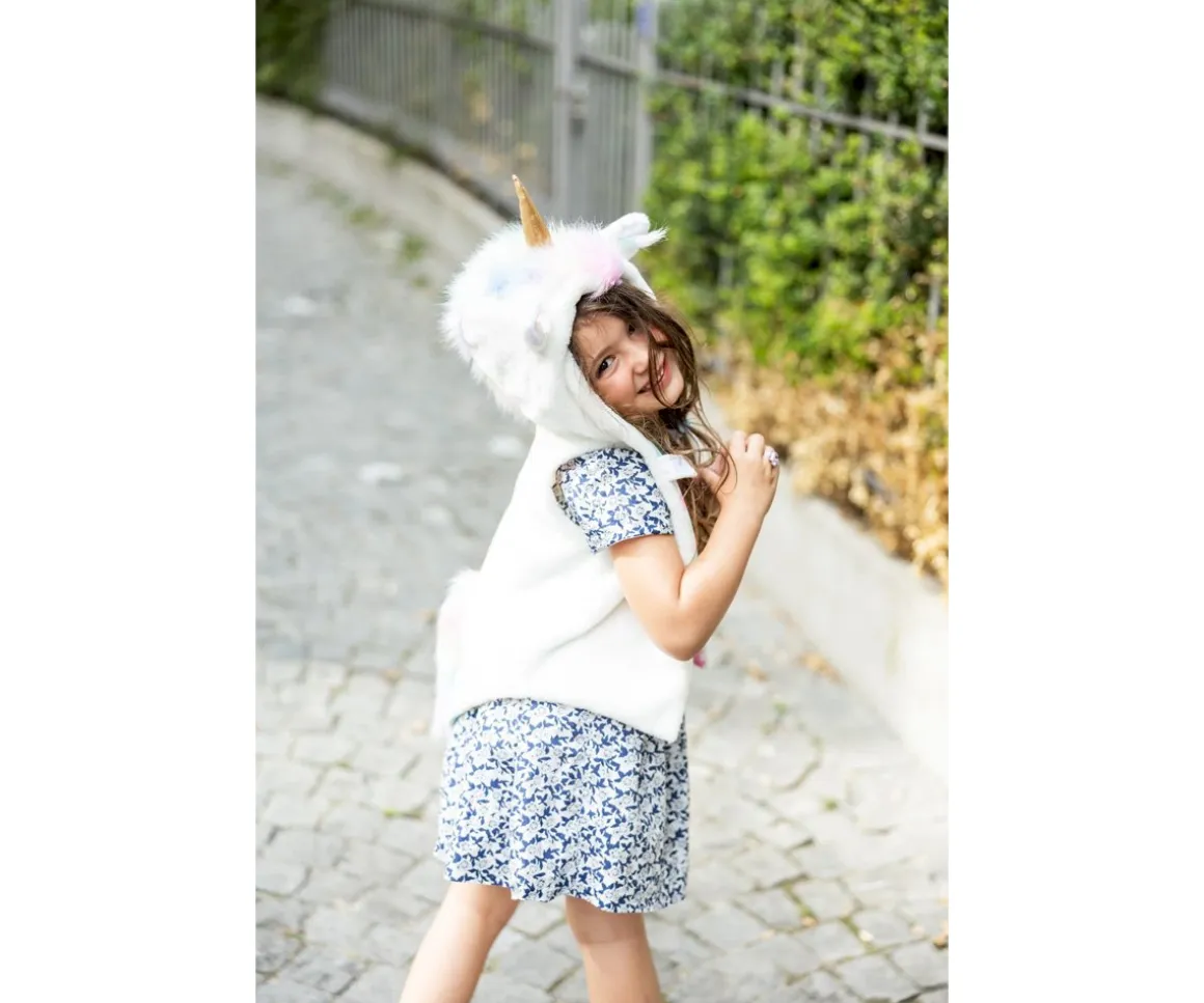 El original disfraz chaleco de unicornio de Great Pretenders está confeccionado con suave pelo blanco, un cuerno dorado y forrado con tela de cuadros vichy en colores pastel.