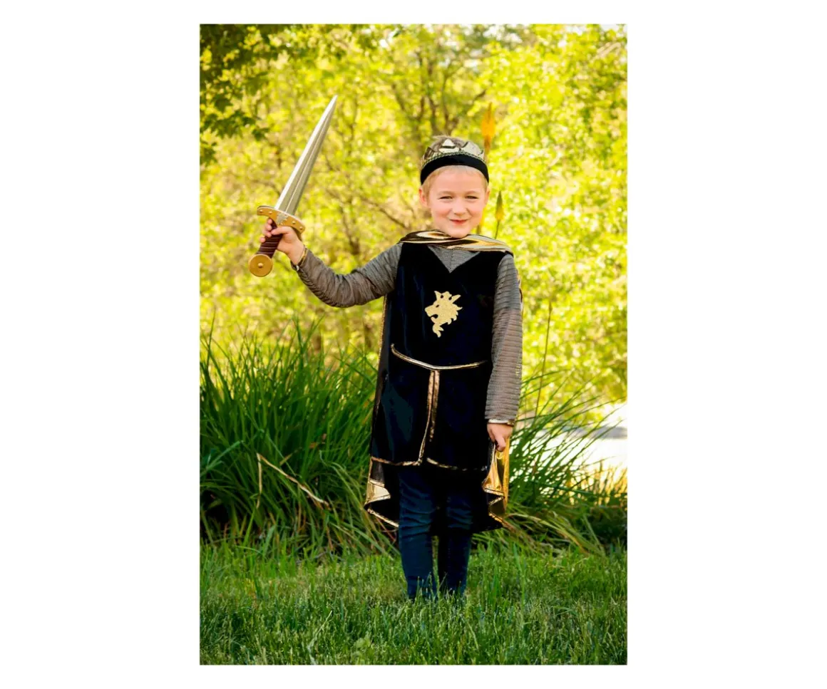 Los peques podrán imaginar que son caballeros con este original traje con detalles dorados. Un emblema de león brillante adorna la parte delantera de la túnica de terciopelo.