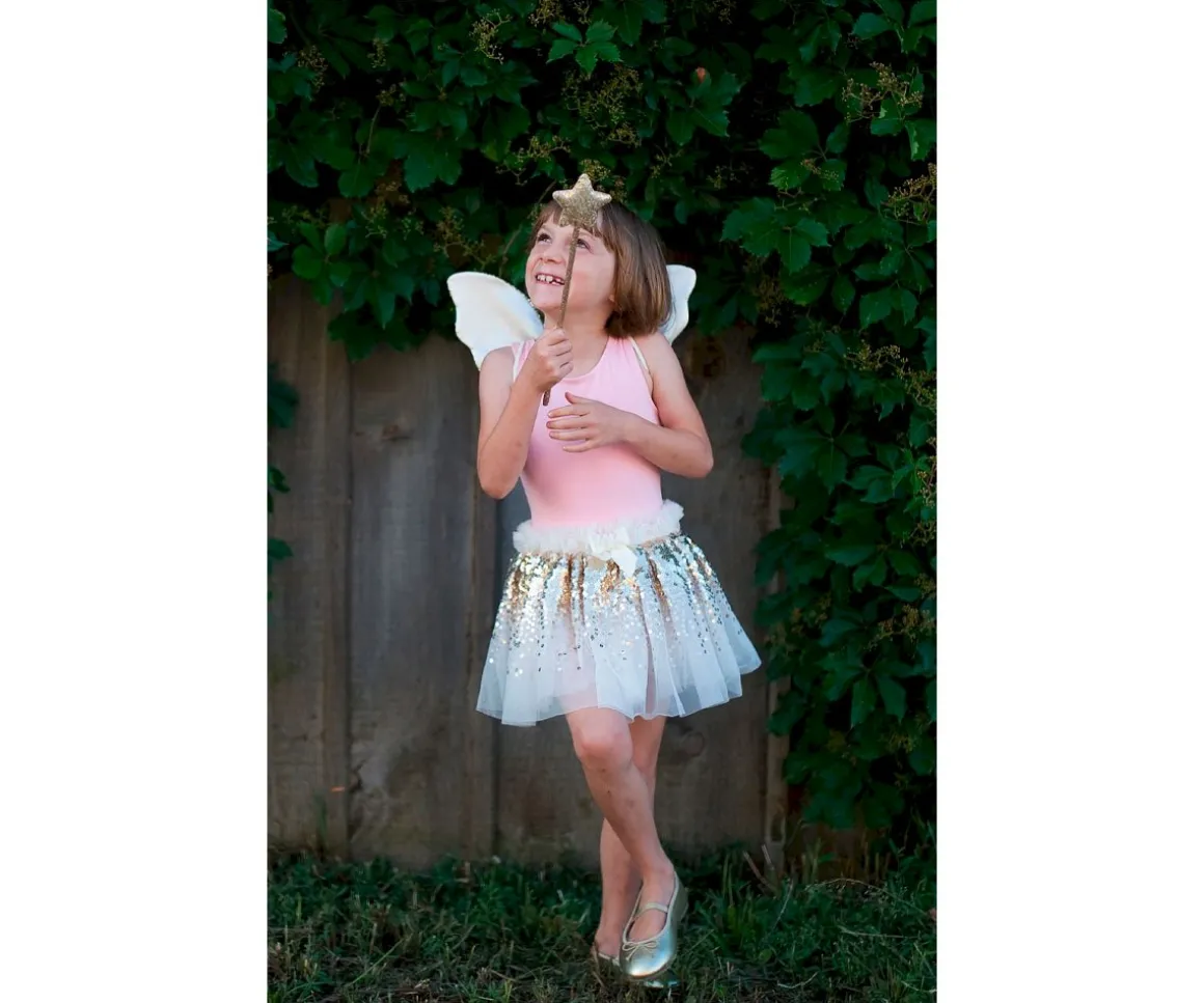 Este precioso disfraz de hada mágica llevará a los más peques a un mundo de fantasía y magia. Cuenta con 3 piezas,una falda tutú crema con lentejuelas doradas,una mágica varita y alas cubiertas de lentejuelas forradas en bonito satén crema.