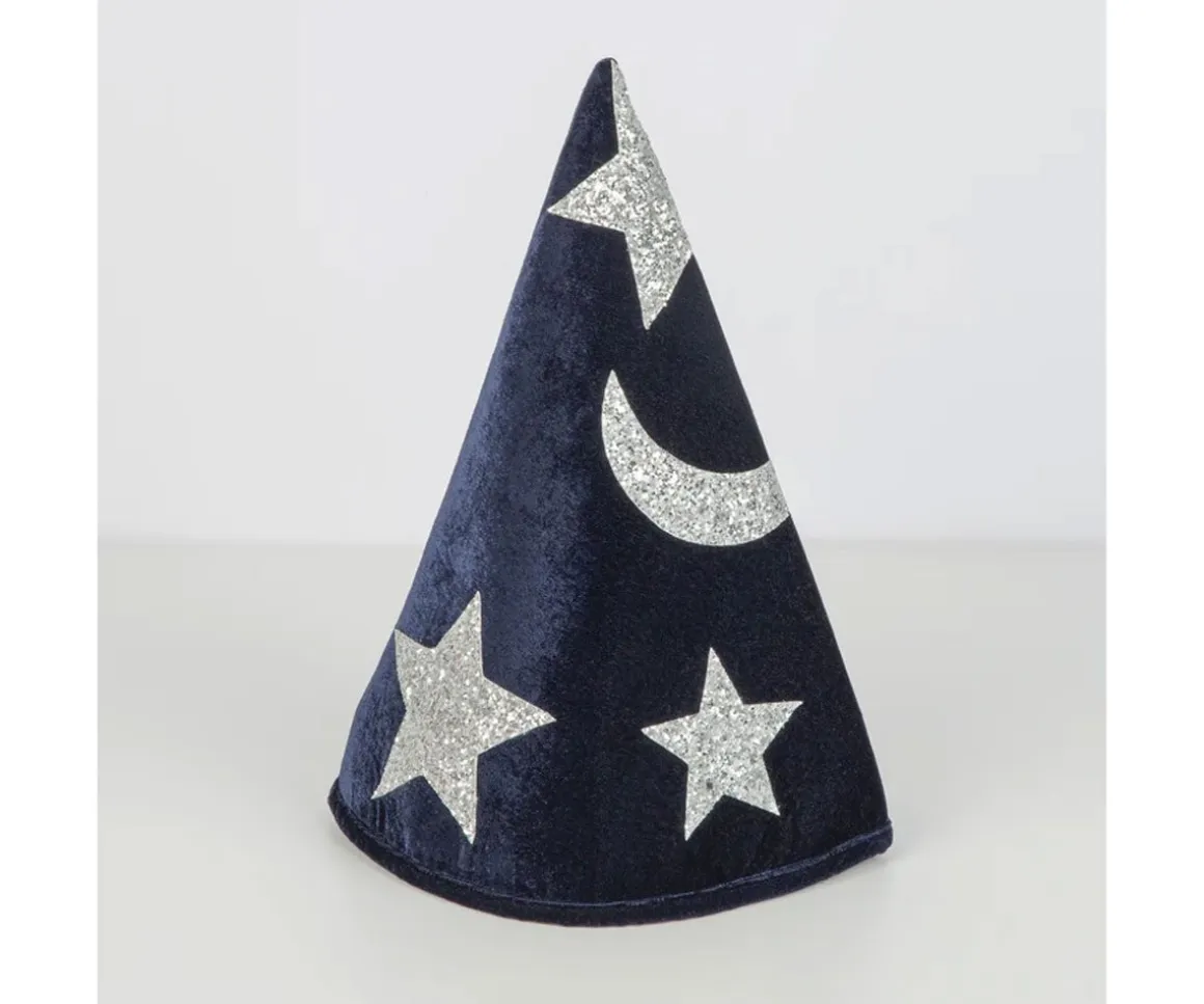 Préparate para convertirte en todo un mago con el lujoso disfraz de terciopelo azul con estrellas y luna de tela con brillo plateado de Meri Meri.