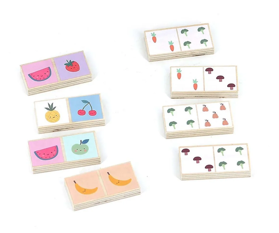 Dominó reversible de frutas y verduras ilustrados por Sarah Betz-Cubeely de Vilac.Con colores suaves, son ideales para niños a partir de 2 años.