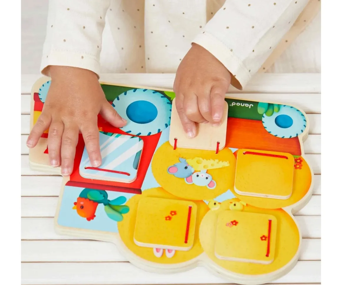 Un tractor de madera que cuenta con 5 ventanas que podrás abrir para descubrir adorables animalitos de granja, un conejo, una oveja, un gatito durmiendo y mucho más.