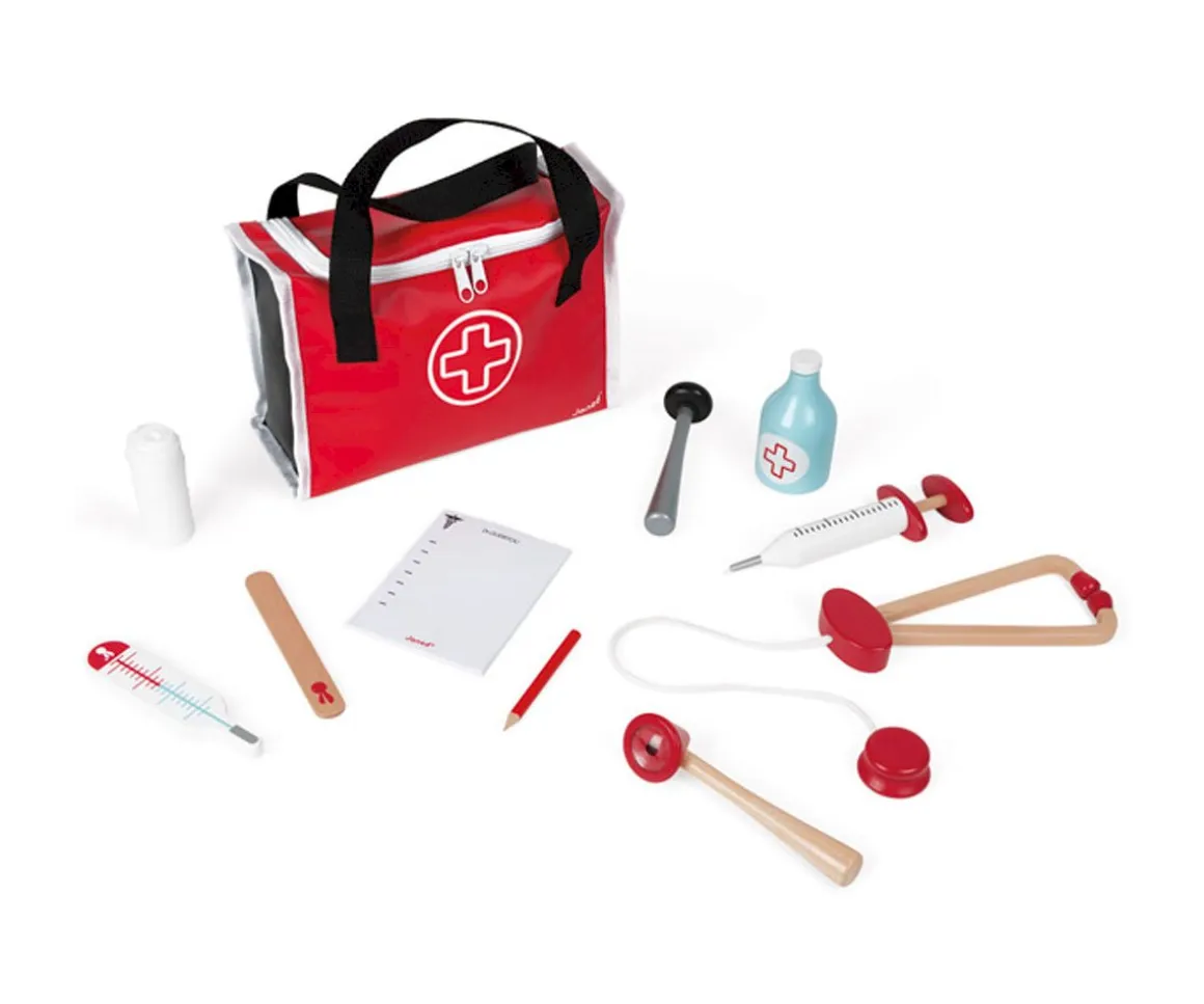 Una jeringa, un martillo para comprobar los reflejos, un estetoscopio…todo de madera, resistente y de calidad.
