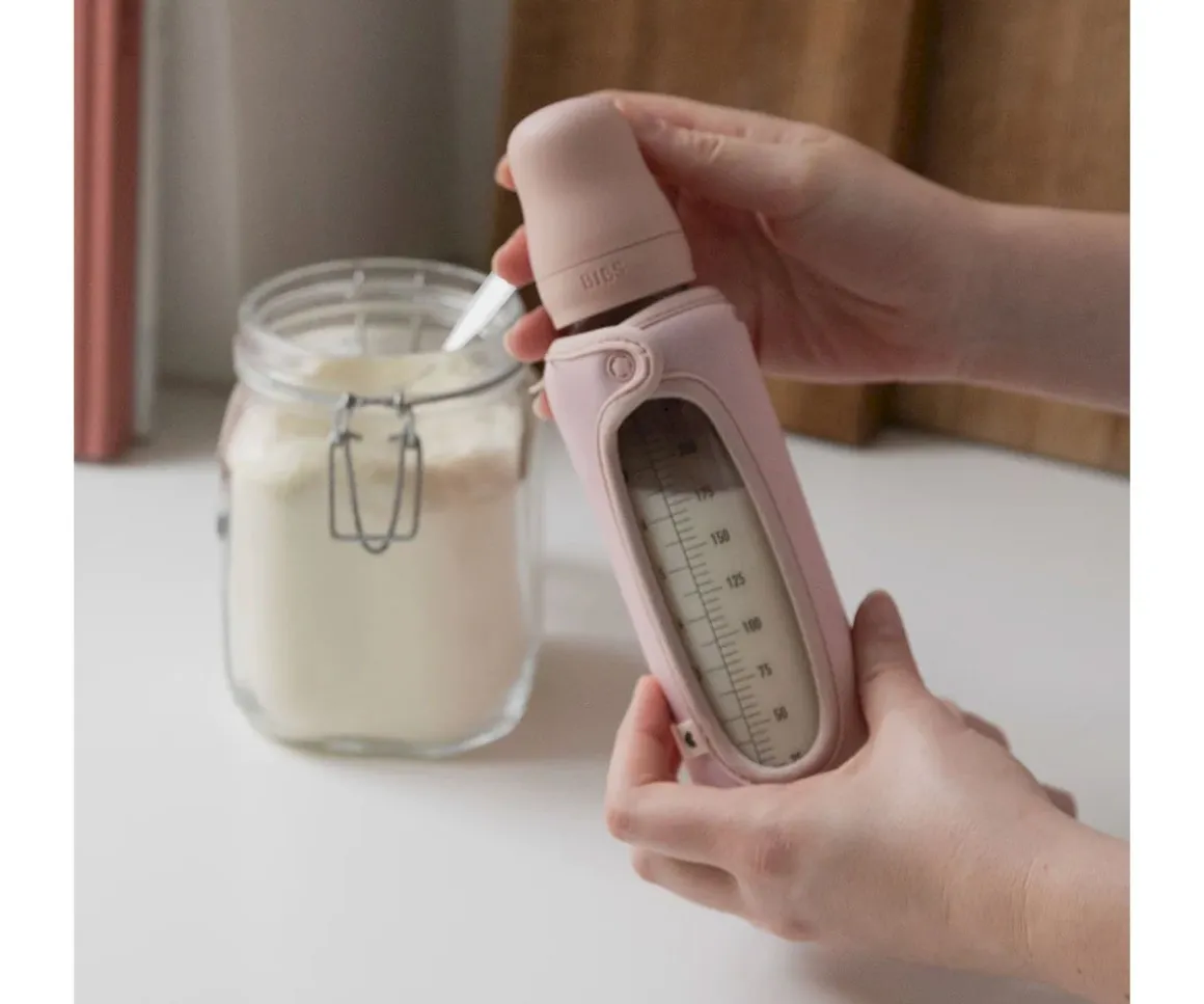 Funda para biberón de neopreno de BIBS que lo protege de golpes, además, tiene una apertura para ver la indicación de medida del biberón y la cantidad que queda.