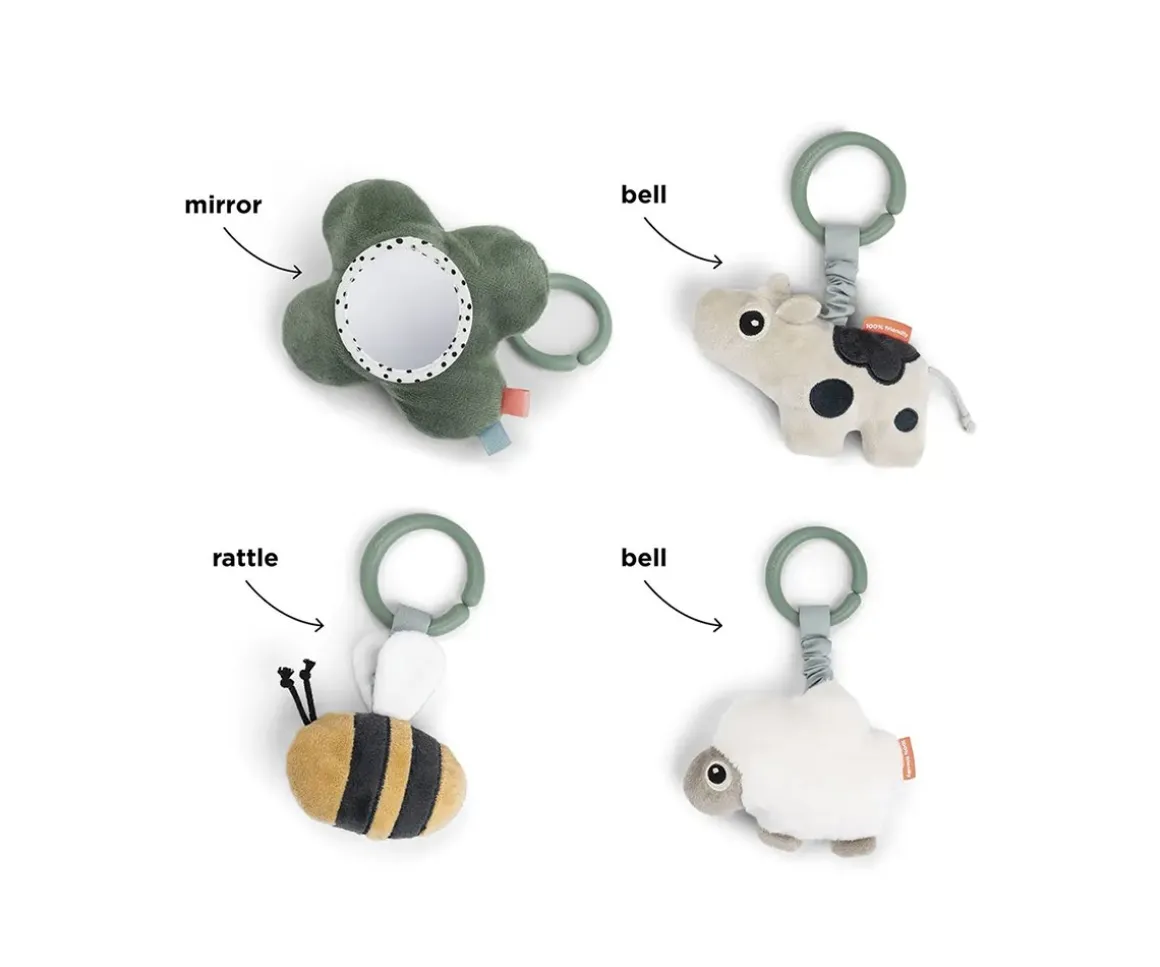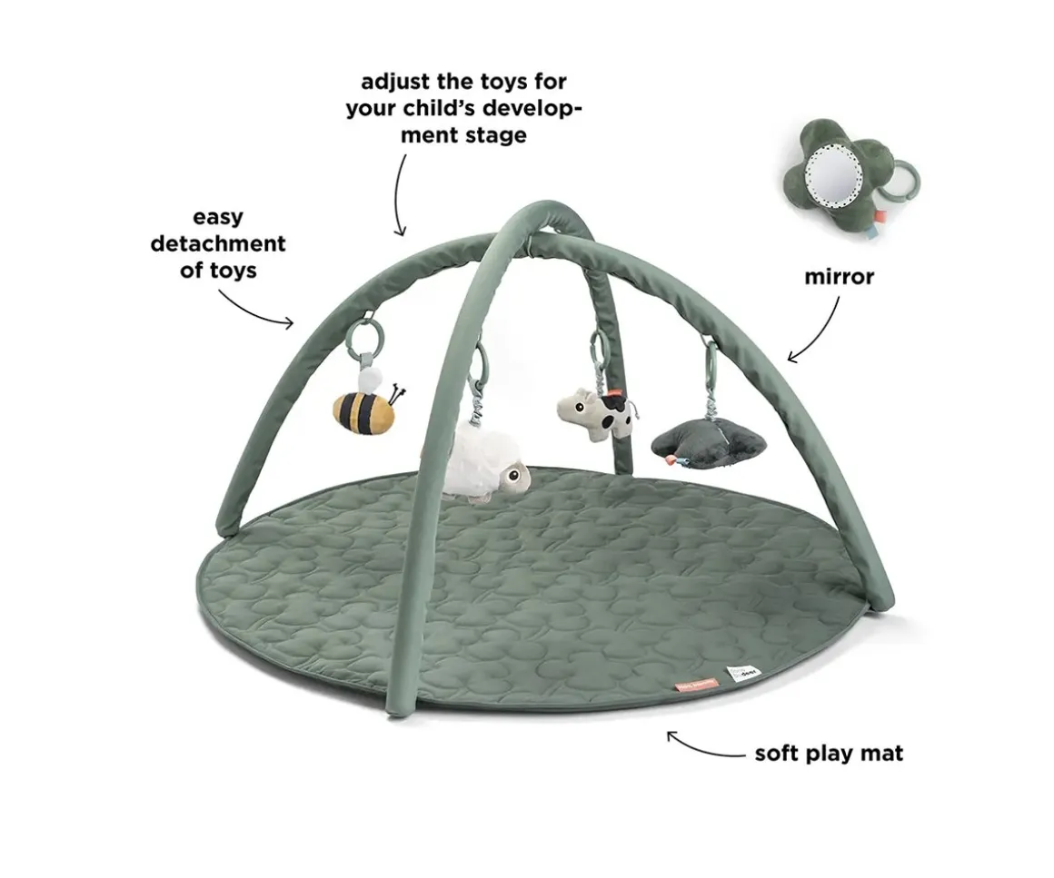- Incluye 4 muñecos de actividades para el gimnasio (una vaca, una abeja, una flor y una oveja)