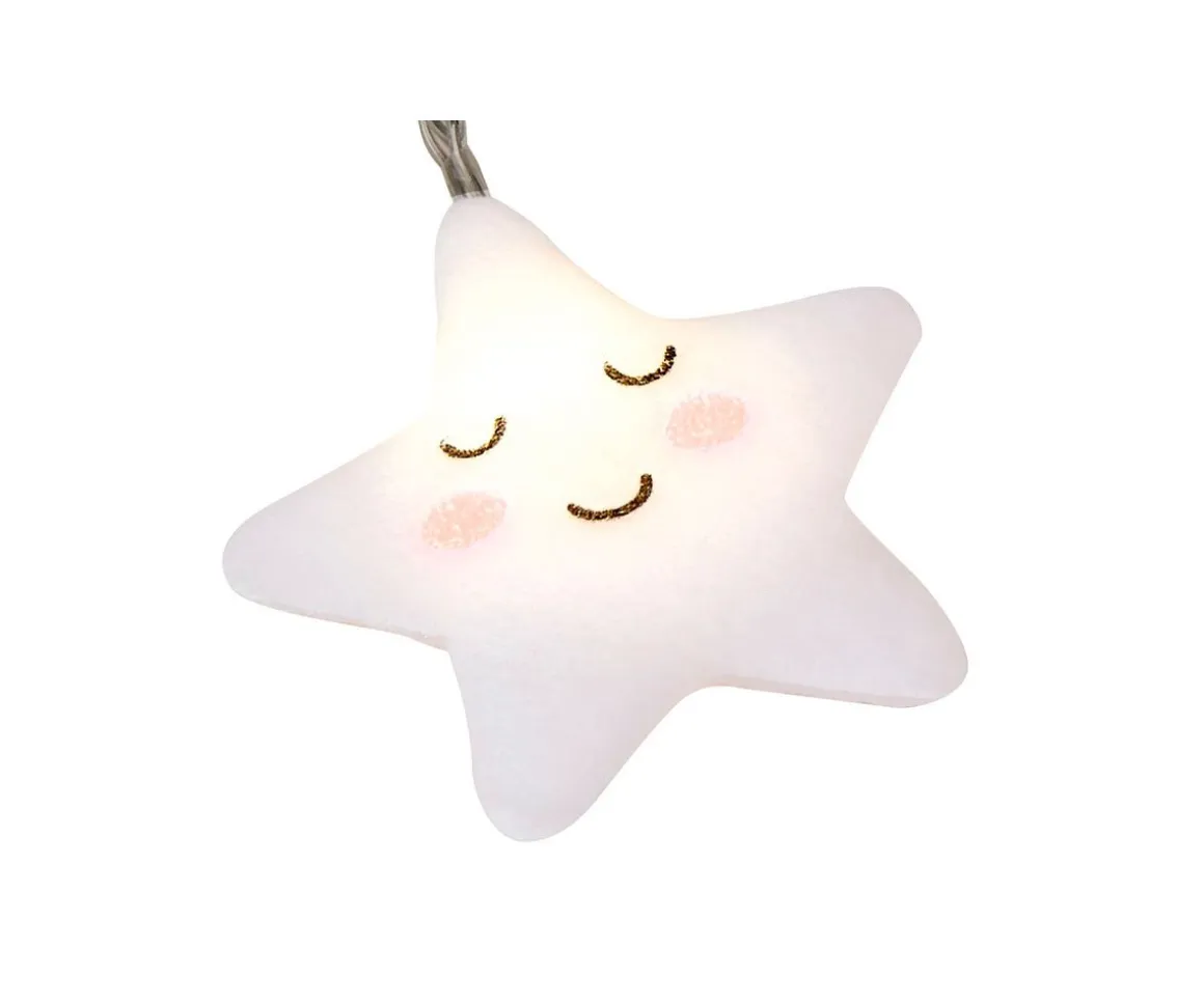 - Incluye 10 estrellas de peluche blancas con preciosas caritas y LED internos