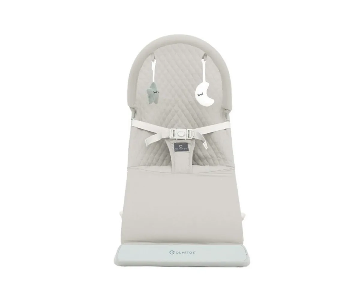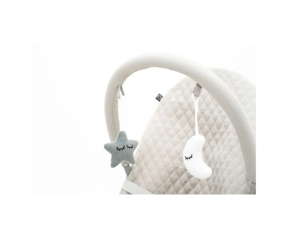 Los movimientos del bebé permiten un balanceo natural que le tranquiliza y relaja como si estuviese en los brazos de mamá o papá, y sus dos posiciones de reclinado permiten al bebé relajarse o compartir grandes momentos con el resto de la familia. También cuenta con una función de vibración, 8 melodías diferentes y un juguetero extraíble con dos simpáticos peluches de una estrella verde y una luna blanca.