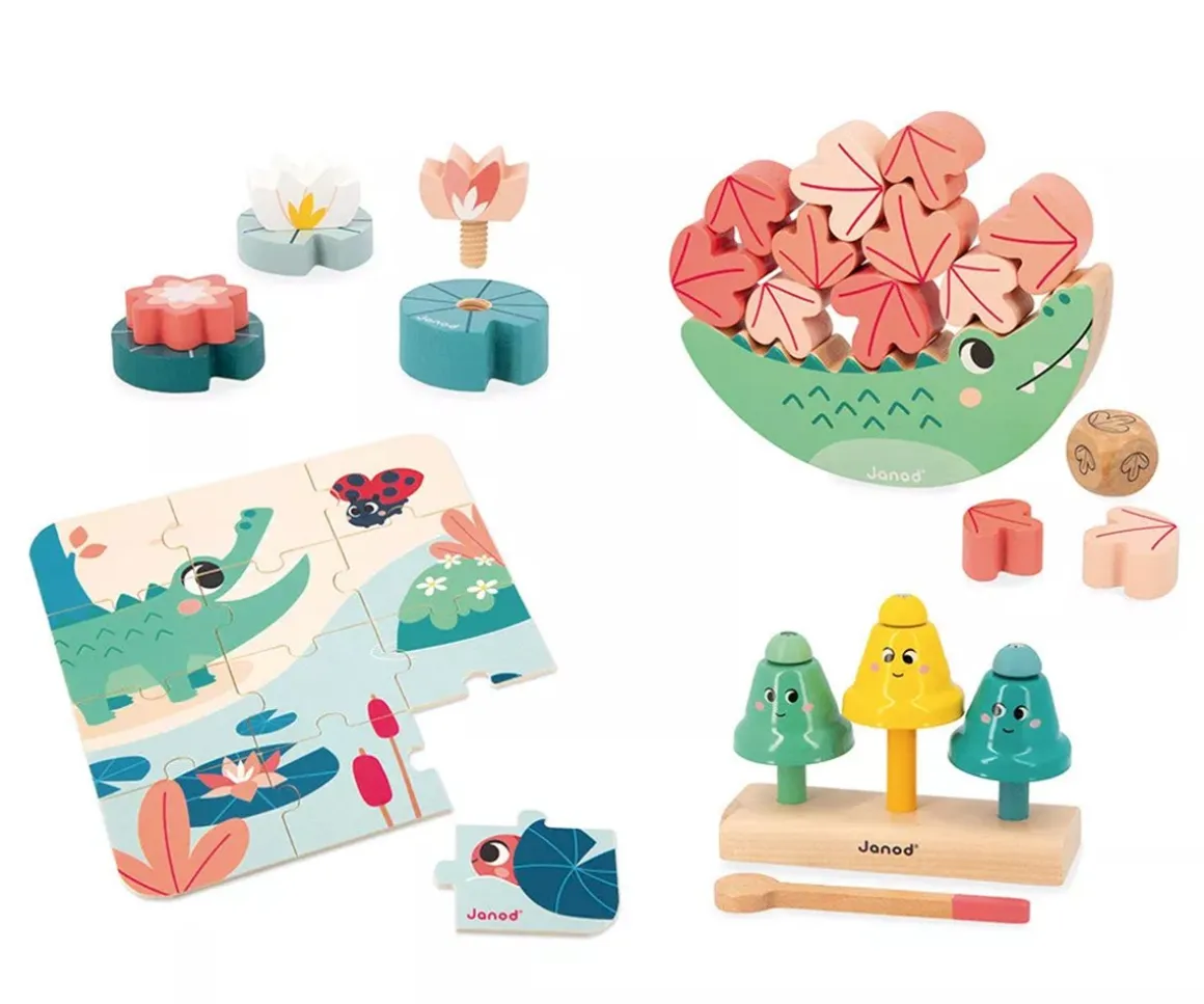 - Juego de Equilibrio Cocodrilo: el objetivo es apilar las hojas de madera sin que se caigan, hay 2 tamaños para mayor dificultad.