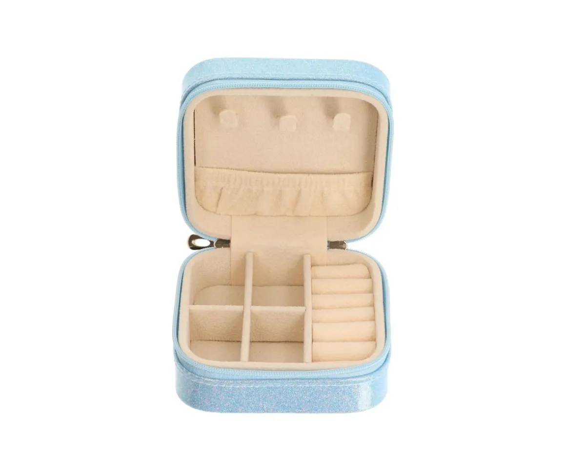 Guarda todos tus cumplementos preferidos bien ordenados en este precioso joyero con acabado de purpurina y cierre de cremallera, gracias a su interior compartimentado.